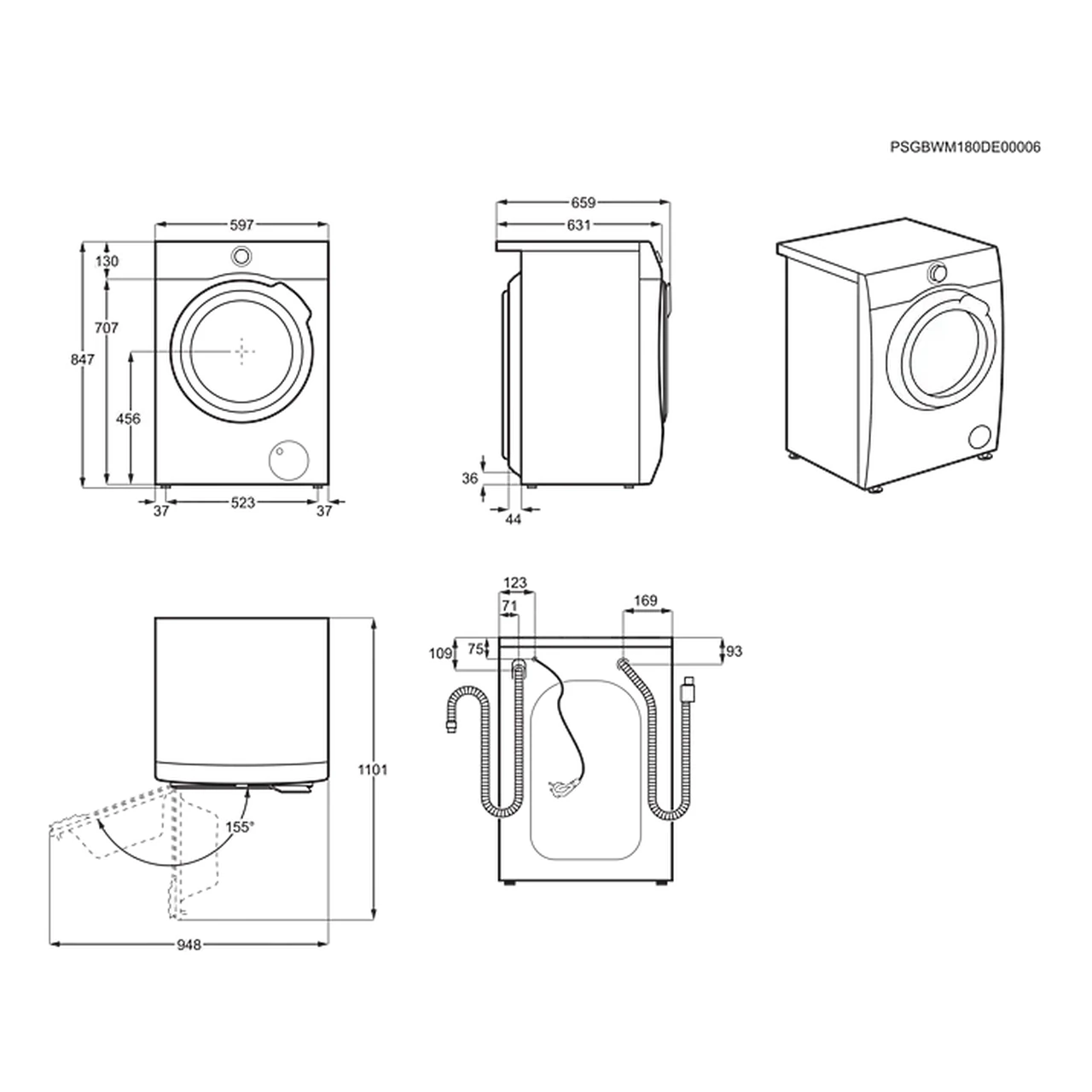 Kuivatiga pesumasin AEG LWR96944B on vabaltseisev seade, mis sobib standardse umbes 60 cm laiuse nišiga kööki või vannituppa. Maksimaalne sügavus on ligikaudu 66 cm ja kõrgus umbes 90 cm, mistõttu on see lihtne paigutada enamiku tööpindade alla või eraldiseisvale kohale. Valge korpus sobitub neutraalselt erineva sisekujundusega ja 2‑ühes lahendus on eriti praktiline, kui eraldi kuivati jaoks ruumi ei ole.