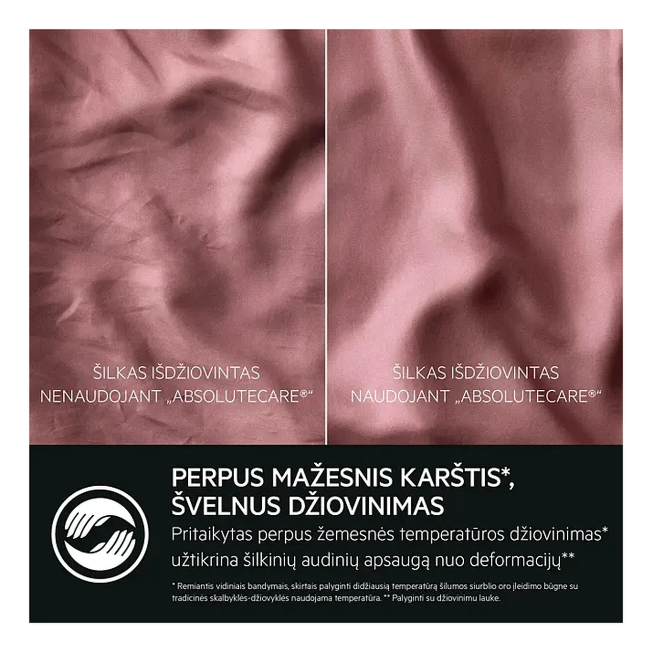 AEG 9000 seeria AbsoluteCare tehnoloogia kasutab soojuspumba lahendust, et hoida kuivatusõhu temperatuuri madalamal kui traditsioonilistes kondensatsioonkuivatiga pesumasinates. Spetsiaalsed trumli liikumised kohanduvad erinevate kangastega, nii et villased riided, välirõivad ja ka õrn siid saavad sobiva hoolduse. Tootja sisemised võrdlustestid näitavad, et madalam kuivatustemperatuur aitab säilitada kangaste kuju võrreldes tavalise õhukuivatusega.