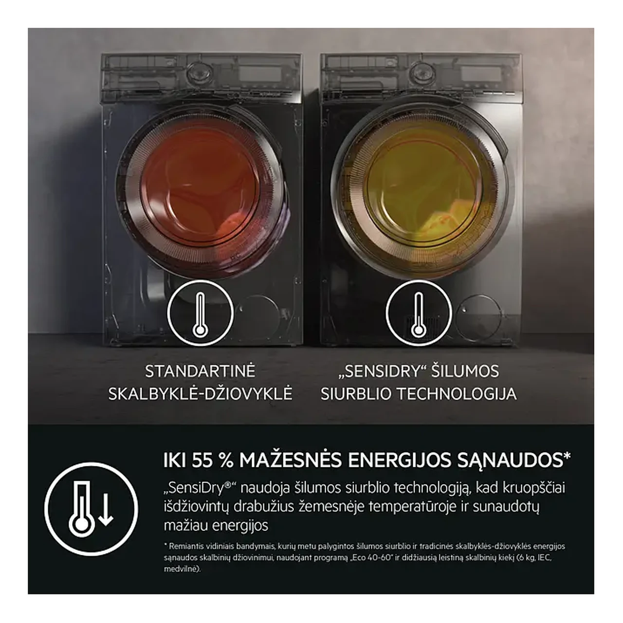 SensiDry tehnoloogia kasutab soojuspumpa, et kuivatada pesu madalamal temperatuuril, juhtides soojuse tõhusalt ringlusse. Tootja sisetestide põhjal võib soojuspumbaga kuivatuse energiakulu väheneda kuivatamise faasis kuni ligikaudu 55 protsenti võrreldes AEG traditsioonilise kondensatsioonkuivatiga pesumasinaga. Madalam temperatuur tähendab, et riided puutuvad vähem kokku tugeva kuumusega ja võivad seetõttu oma välimust kauem säilitada.