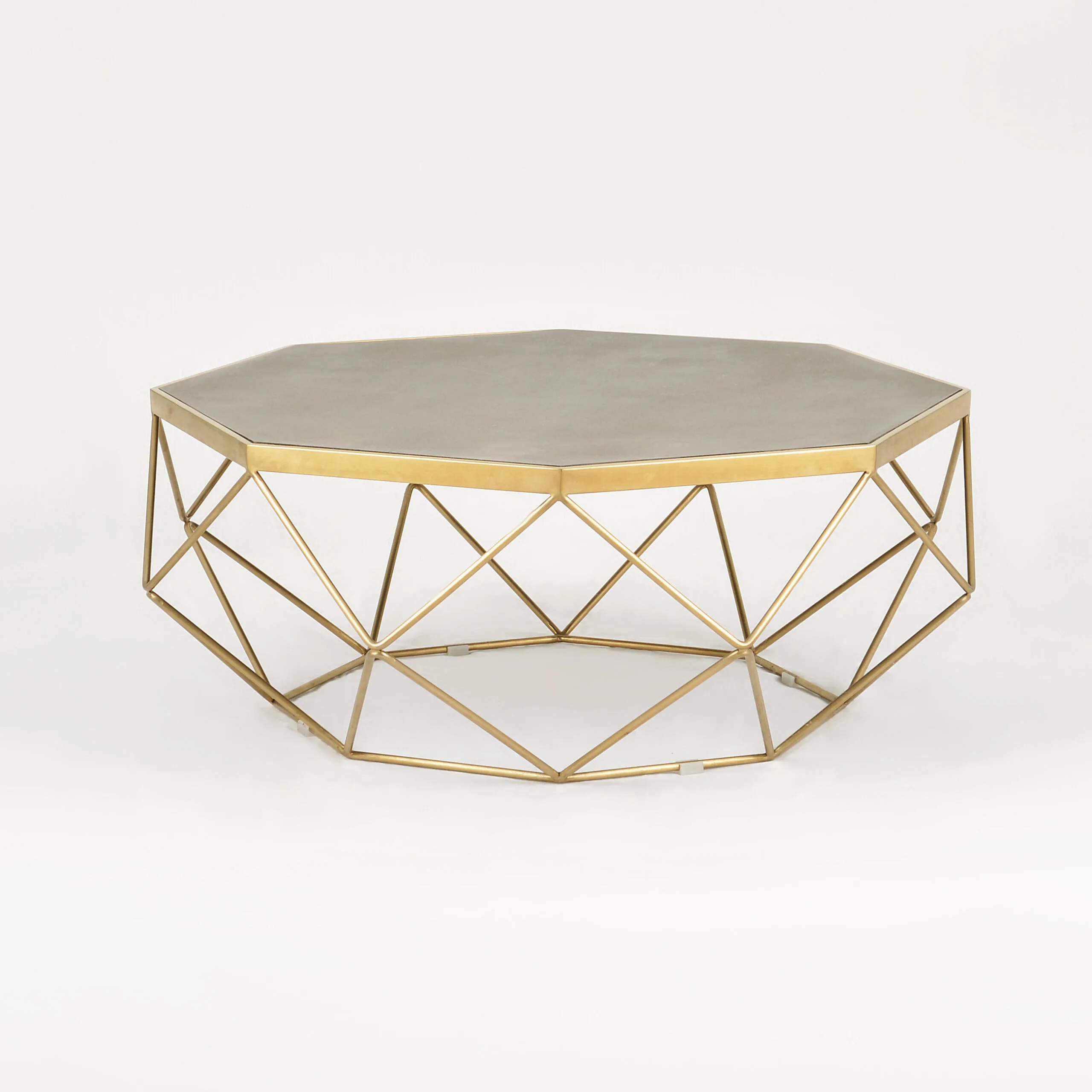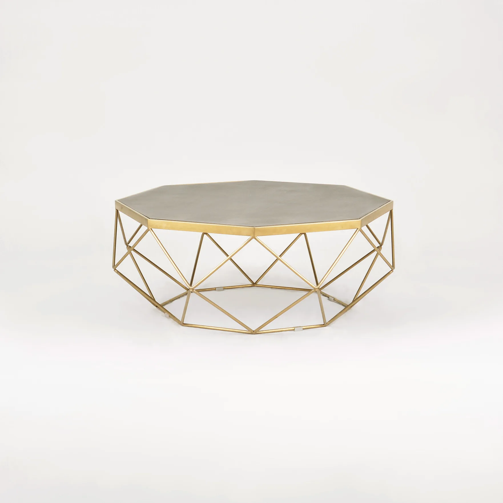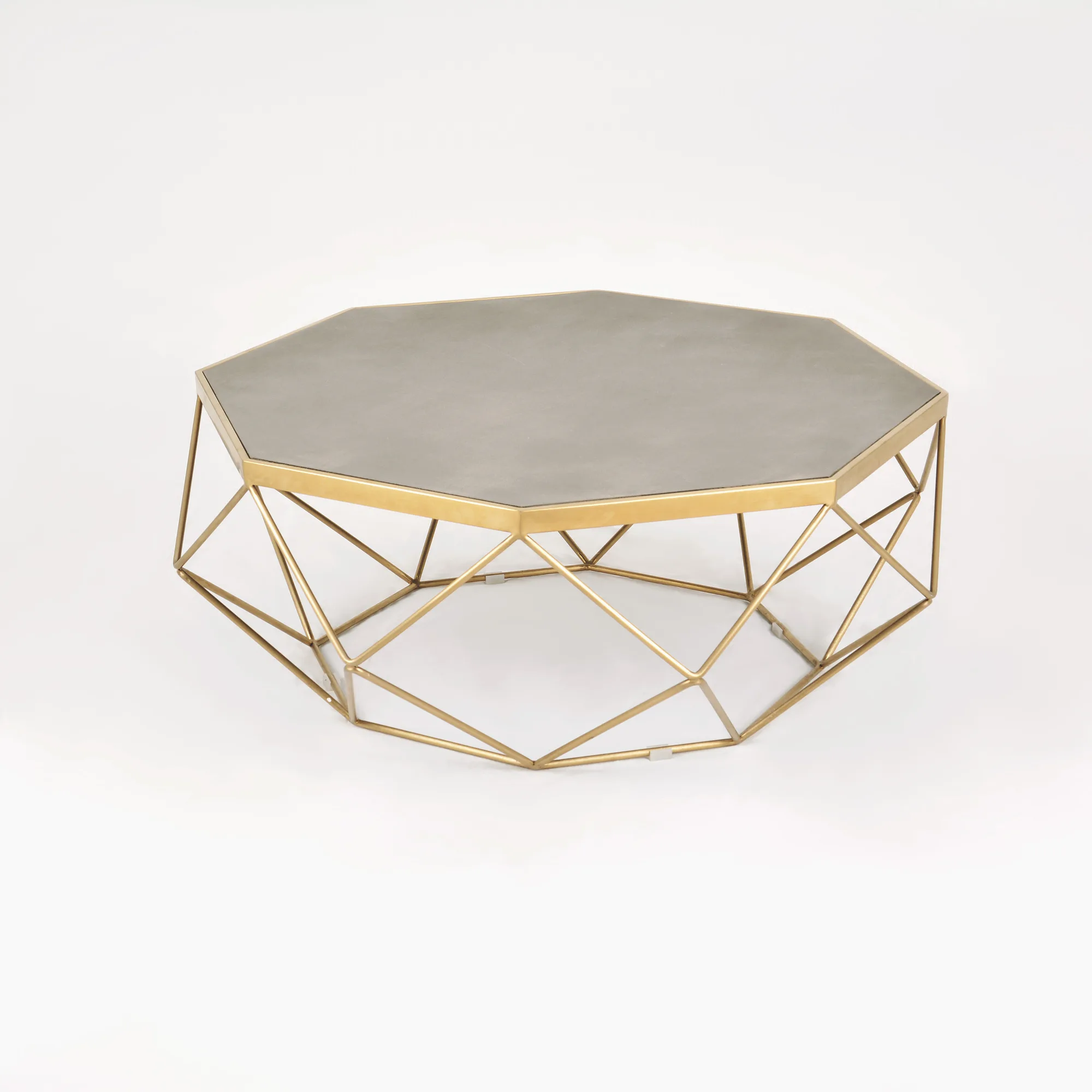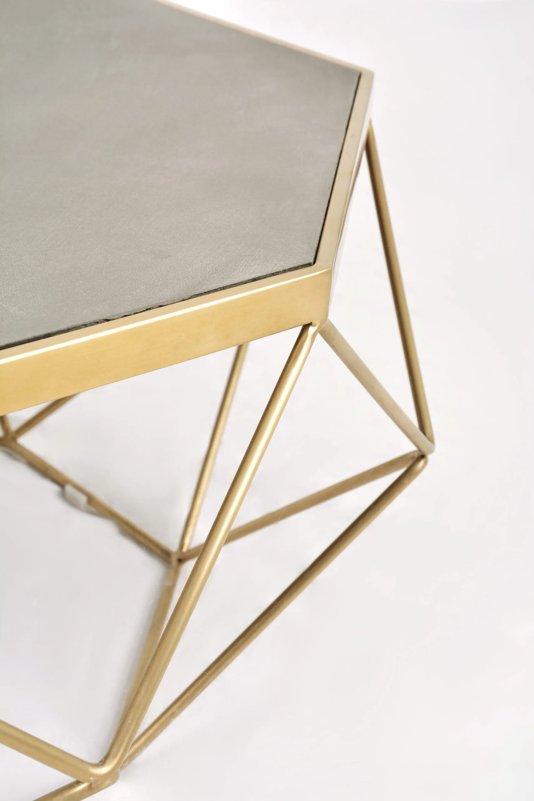 Glamour GL1714 kohvilaud elutuppa. See stiilne kohvilaud lisab teie elutuppa modernset ja glamuurset hõngu. Geomeetrilise kujuga kuldne roostevabast terasest raam toetab MDF-plaadist valmistatud kaheksanurkset lauaplaati, mis imiteerib toorest betooni. See ainulaadne disainielement loob ruumis pilkupüüdva keskpunkti.