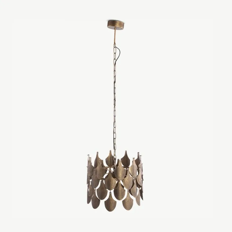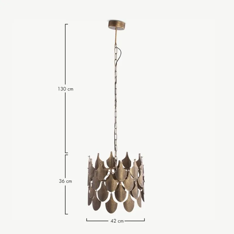 Selle 42 cm laiuse ja 36 cm kõrguse ripplambi kuldne viimistlus loob sooja ja kutsuva õhkkonna. Tänu oma ajatule välimusele täiustab see nii elu- kui ka söögituba ning sobib suurepäraselt ka magamistuppa stiilse aktsendina.