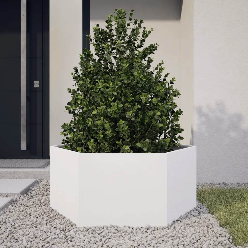 See kuusnurkne aia peenrakast loob selge ja korrastatud istutusala lilledele, ürtidele või juurviljadele. Valgest terasest konstruktsioon talub hästi välistingimusi ning avara kujuga kast pakub rohkelt mulda ja kasvuruumi, et taimed saaksid hästi areneda.