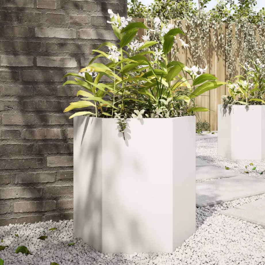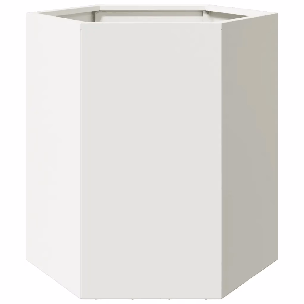 - 1 kuusnurkne aia taimekast valgest terasest, mõõtmetega 46 x 40 x 45 cm, ilma põhjata