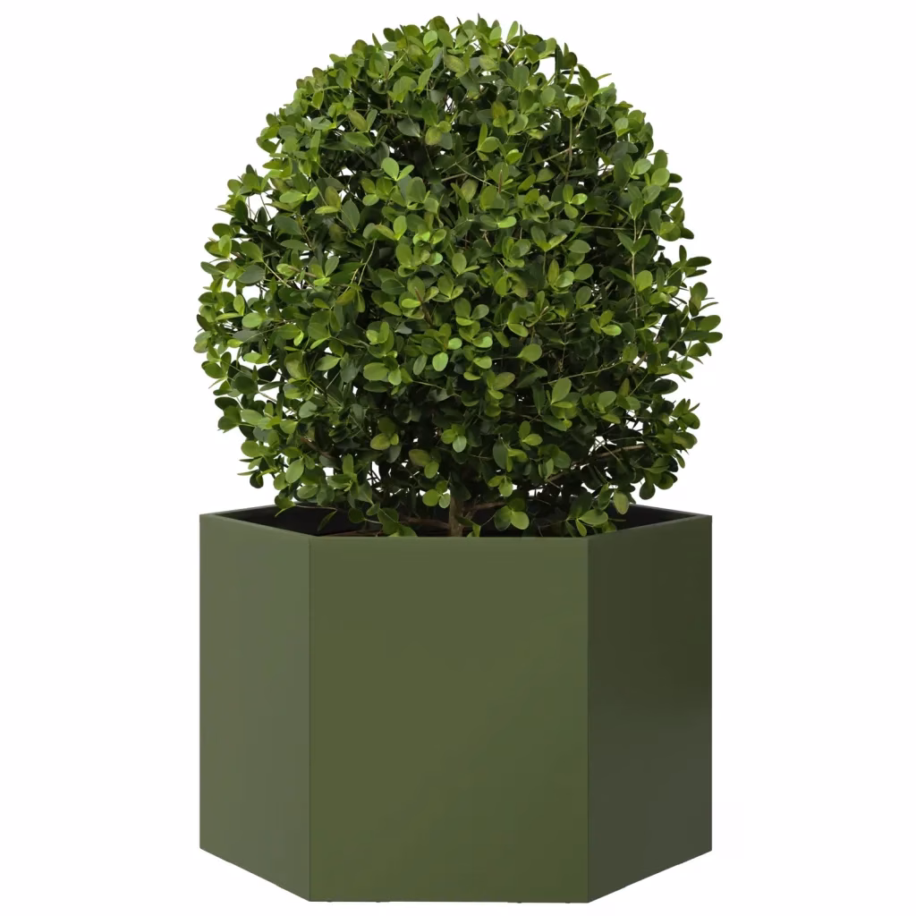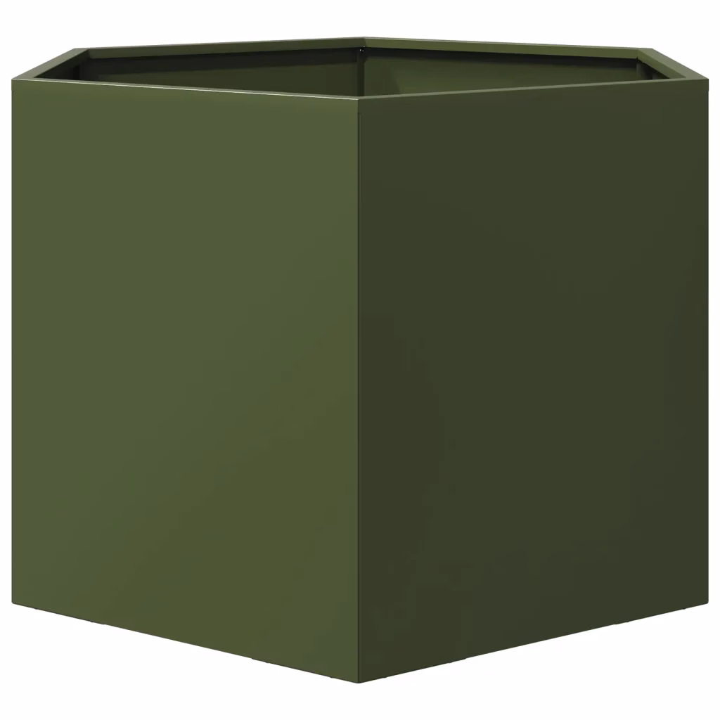 See oliiviroheline kuusnurkne aiataimekast on hea valik, kui soovite aias luua selgepiirilise ja vastupidava peenra väiksemas või suuremas õuealal. Tugev teras, avatud põhi ja kõrgendatud ehitus toetavad tervet taimede kasvu ning aitavad hoida aia korrastatud ja hooldatava.