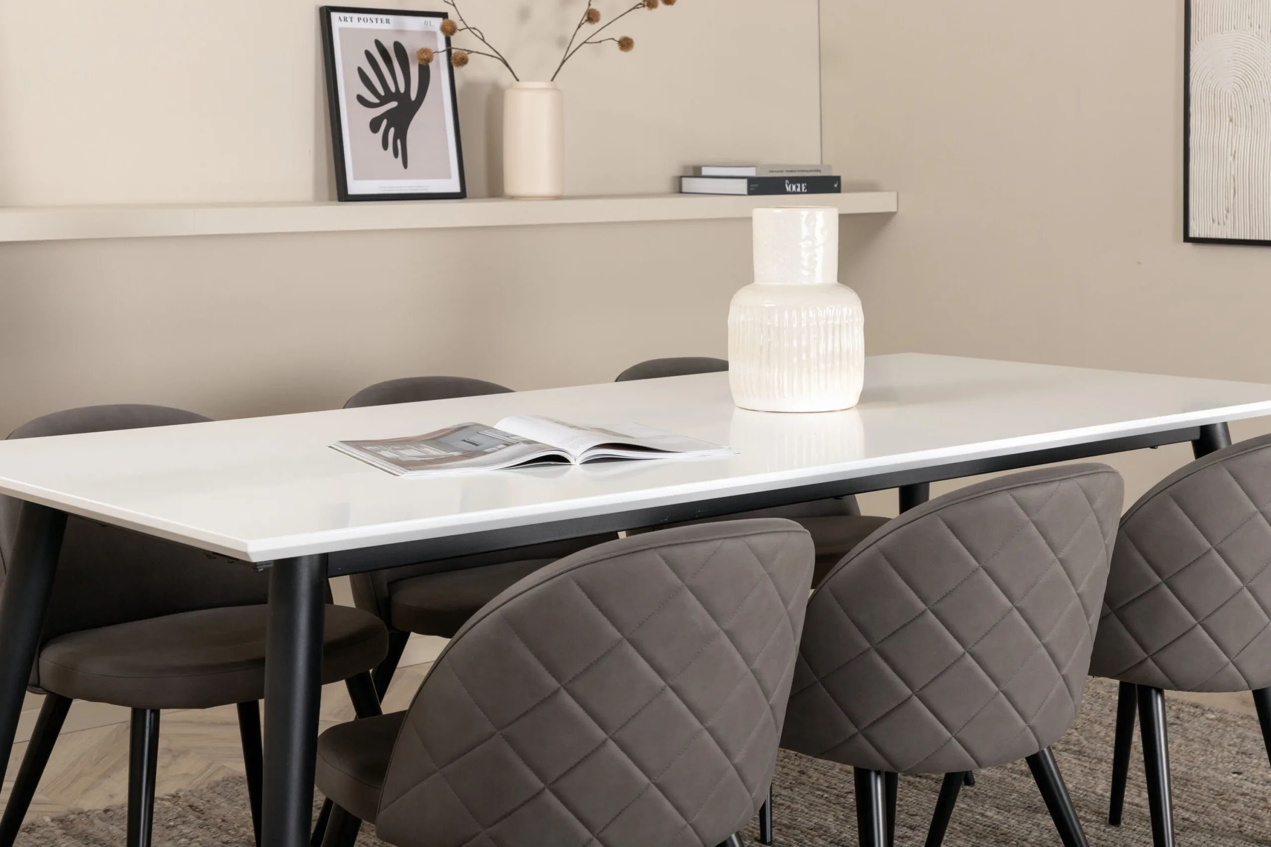 • Kuus halli mikrokiust Velvet Stitches söögitooli – pehme polster, mustad metallist jalad ja seljatugedel dekoratiivsed õmblused.