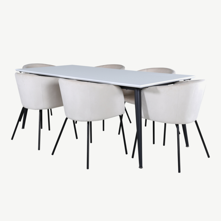 Jimmy ristkülikukujuline söögilauakomplekt ühendab modernse disaini ja praktilisuse, sobitudes suurepäraselt nii avarasse elutuppa kui ka hubasesse kööki. Komplekti kuulub funktsionaalne, laiendatav valge söögilaud ning neli musta sametkattega Kenth tooli, mis pakuvad mugavust igal söögikorral ja koosviibimisel. See laiendatav valge söögilaua komplekt on ideaalne valik, kui otsid paindlikkust ja põhjamaist stiili.