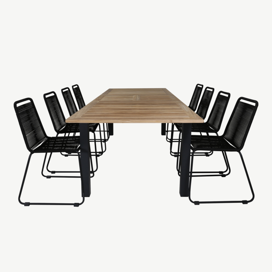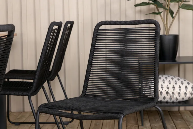 - Iste: komplekti kuuluvad 8 musta Lindos söögitooli, mis on kuhjatavad. Toolide raam on vastupidavast terasest ning isteosa on punutud UV-kindlast polüestrist köiest. Iga tooli kandevõime on kuni 150 kg, istumismugavus tagatud tänu optimaalsele vormile (mõõdud: 86×57×59 cm).