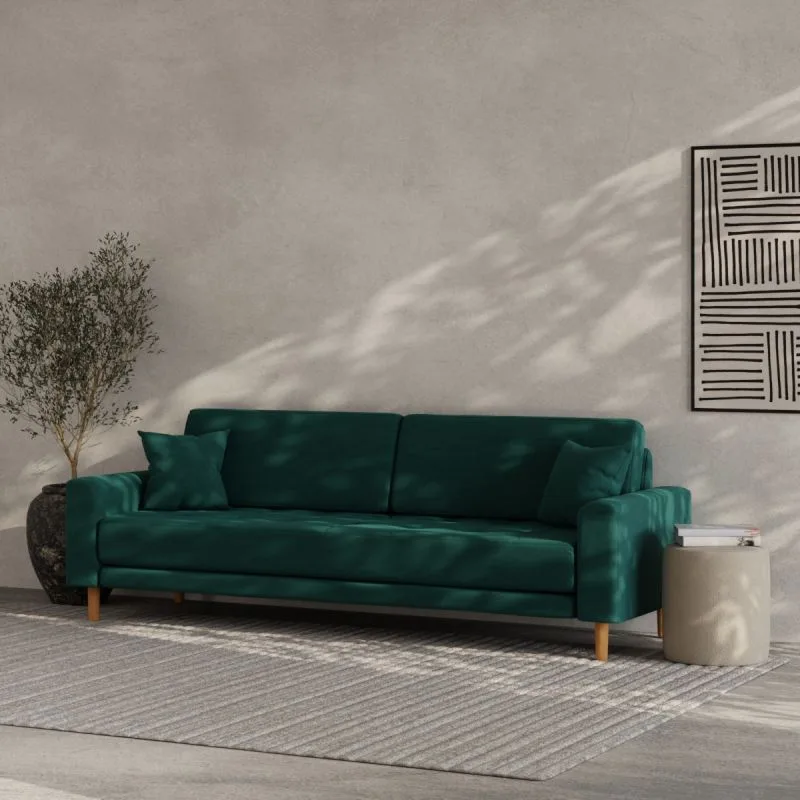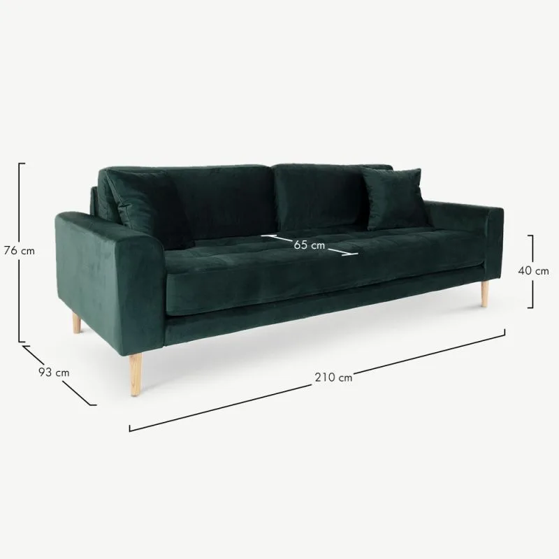 Diivani laiuseks on 210 cm, pakkudes avarat istumisruumi nii pereõhtuteks kui ka külaliste võõrustamiseks. Sügav, 65 cm istumisosa ning kaks mugavat patja loovad täiusliku keskkonna lõõgastumiseks. Pehme sametine kangas tundub nahal meeldiv ning annab diivanile luksusliku välimuse, samas kui tumeroheline värv loob rahuliku ja hubase atmosfääri.