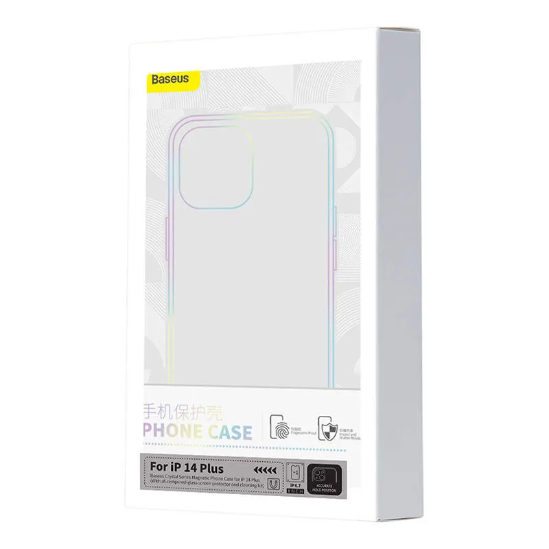 Baseus Crystal Series magnetiline ümbris iPhone 14 Plus + karastatud klaas hoiab telefoni kaitstuna ja nähtavalt ilusana