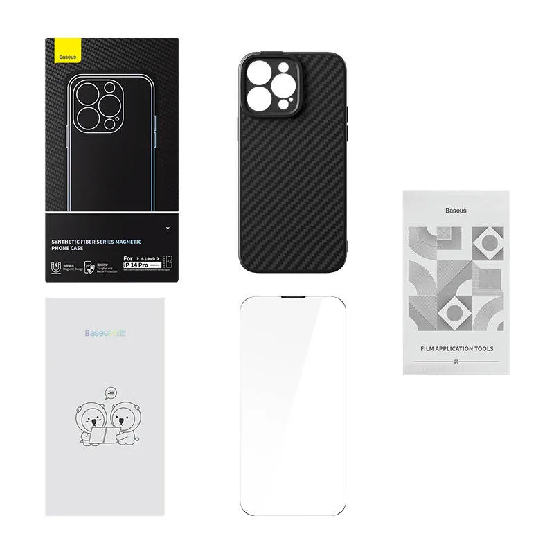 Magnetitega kaitseümbris iPhone 14 Pro-le Baseus Synthetic Fiber Series ARQW000101, TPU+sünteetkiud, must, 38 neodüümmagnetit, MagSafe-ühilduv, kaamerakaitse, karastatud klaas ja puhastuskomplekt