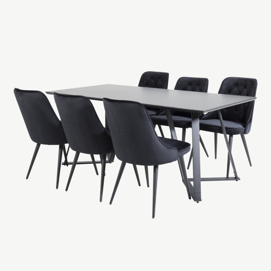 Musta lauaplaadiga söögilauakomplekt Marina ühendab modernsuse, vastupidavuse ja mugavuse. Komplekt koosneb ühest ruumikast ristkülikukujulisest lauale ja kuuest luksuslikust Velvet Deluxe toolist, mis on kaetud pehme musta polüester-velvetkangaga. See sobib suurepäraselt põhjamaise sisekujunduse armastajale, tuues söögituppa elegantse ja praktilise keskpunkti, kus koos pere ja sõpradega aega veeta.
