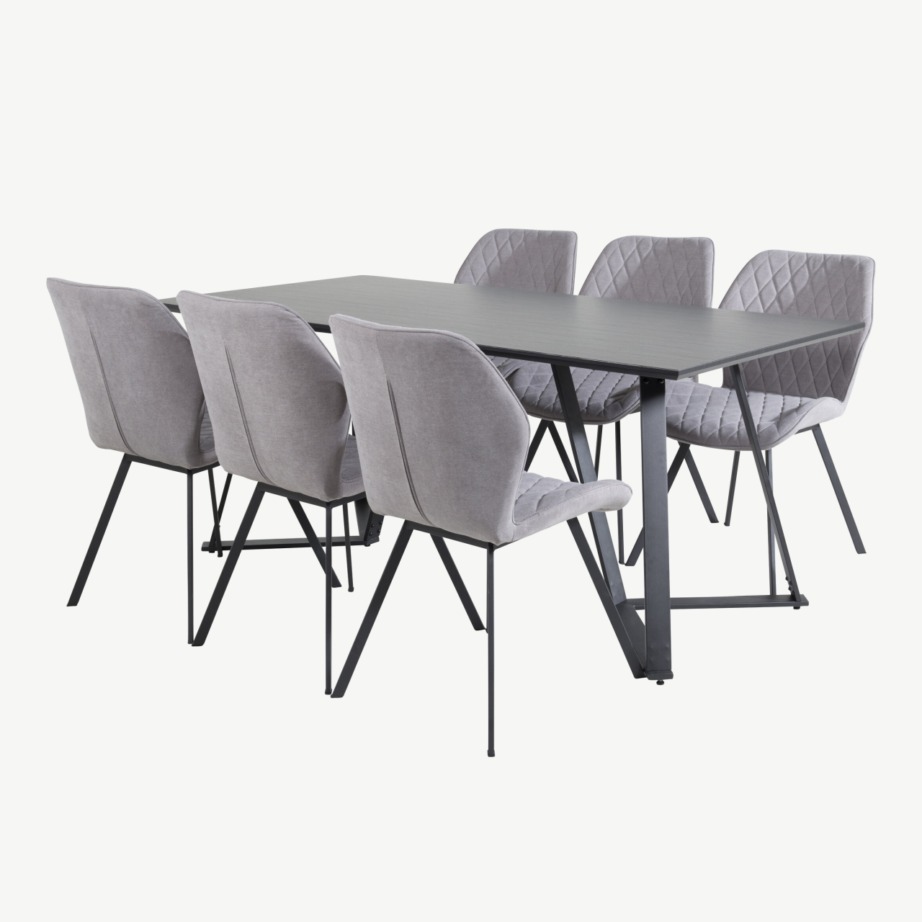 • Komplektis: üks Marina söögilaud (must pealispind ja mustad metalljalad) ning kuus Gemma söögitooli (hall polüesterkate, mustad metallist jalad). NB! Toolid müüakse ükshaaval.