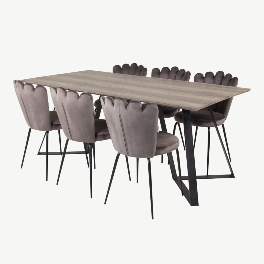 Marina ristkülikukujuline söögilaud koos Limhamni hallide samettoolidega loob harmoonilise ning modernse sööginurga, mis sobib suurepäraselt põhjamaise stiiliga interjööri. See hall söögitoakomplekt on loodud neile, kes hindavad ajatut disaini, kvaliteetseid materjale ja kodusoojust.