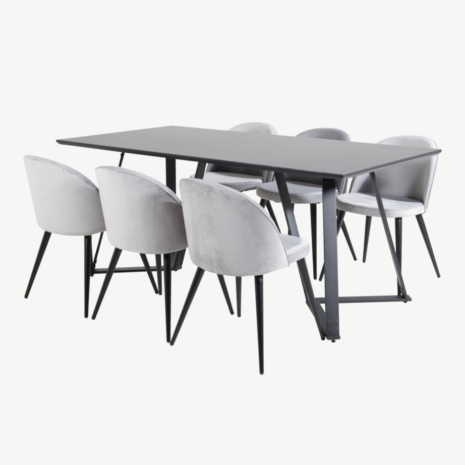 - Komplektis: ristkülikukujuline must söögilaud ja 6 helehallist velvetist tooli