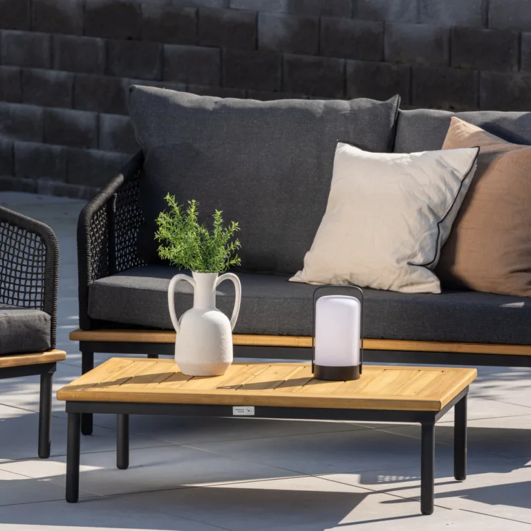 Komplekti kuuluv madal kohvilaud täiendab diivani ja tugitoolide kombinatsiooni täiuslikult. Selle akaatsiapuidust lauaplaat lisab looduslikku ilu, samas kui metallist raam järgib ülejäänud komplekti modernset joont.