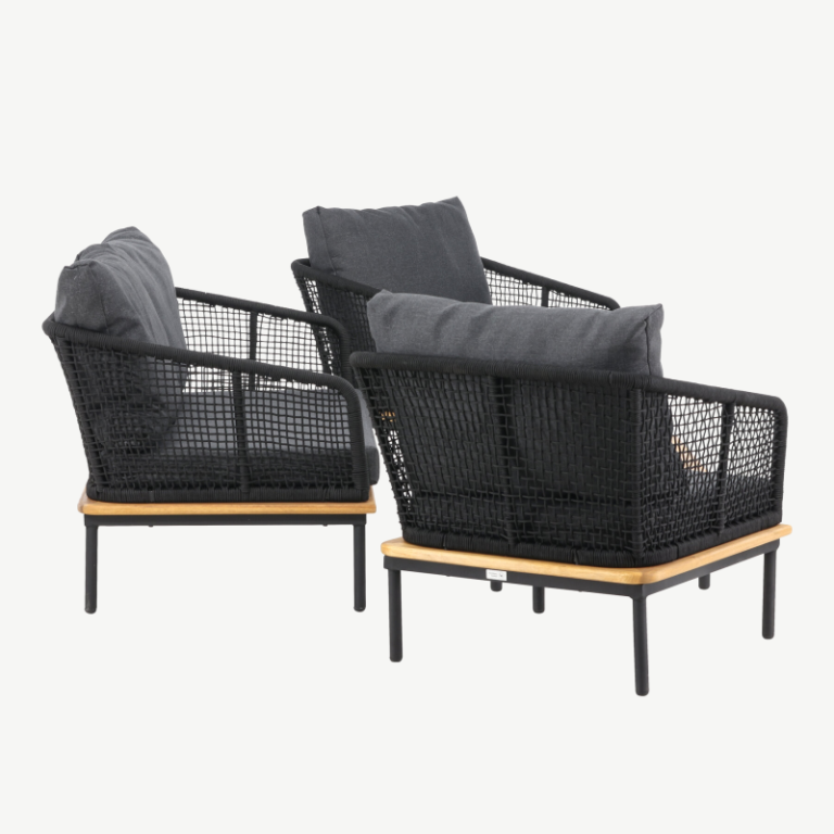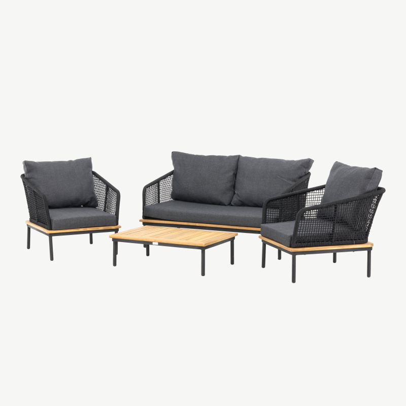 Komplekti tugev raam on valmistatud mustaks pulbervärvitud metallist, mis tagab stabiilsuse ja pikaajalise vastupidavuse. Käetugede stiilsed akaatsiapuidust detailid lisavad soojemat ilmet ja looduslähedust, samal ajal kui mustast köiest seljatugi annab erilise visuaalse aktsendi.