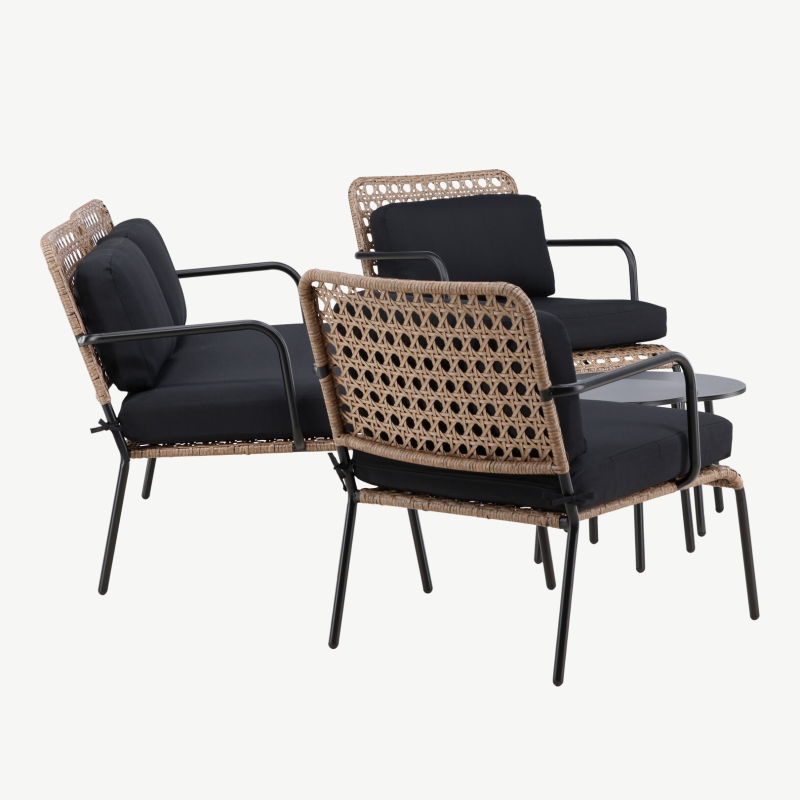 Aiadiivani komplekt Paola on kaasaegne ja mugav lahendus igale terrassile või rõdule. Selle ajatu disain ja kvaliteetsed materjalid tagavad nii vastupidavuse kui ka visuaalse atraktiivsuse. Komplekti kuulub kahekohaline diivan, kaks käetugedega tugitooli ning kaks ümmargust kohvilauda. Mustast pulbervärvitud metallist raamid loovad stabiilse ja tugeva konstruktsiooni, samal ajal kui istme- ja seljatoepinnad on kaunistatud loodusliku rotangpunutisega, mis lisab naturaalset soojust ja elegantsi.