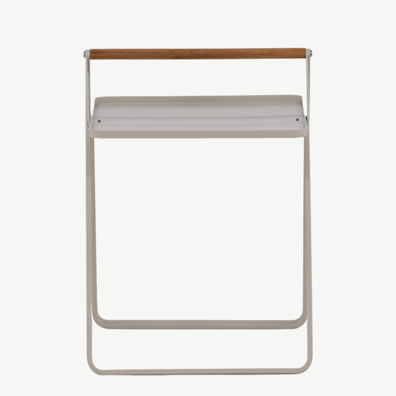 See lisalaud on valmistatud vastupidavast metallist, mis tagab toote pikaealisuse ja stabiilsuse. Kitsad, elegantsed jalad loovad õhulise mulje, samas kui lauaplaadi kohal olev dekoratiivne tiigipuust käepide lisab looduslähedast soojust ja eksklusiivsust. Tiigipuit on tuntud oma ilmastikukindluse poolest, mistõttu sobib see suurepäraselt välistingimustesse.