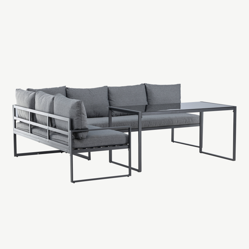 Zingaro nurgadiivanikomplekt ühendab endas modernse välimuse, funktsionaalsuse ja mugavuse, luues ideaalse lounge-nurga Sinu aeda või terrassile. Komplekti tugev musta terasraamiga aiadiivan koos hallide vetthülgavate polüestripatjade ning elegantse klaasist lauaplaadiga lisab igale välialale ajatu ja pilkupüüdva ilme. Komplekt kuulub hinnatud Venture Home kollektsiooni ning on loodud kestma kõigis tingimustes.