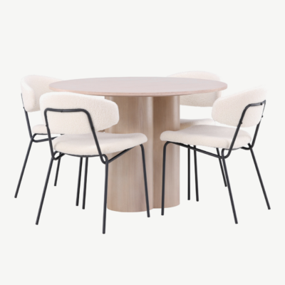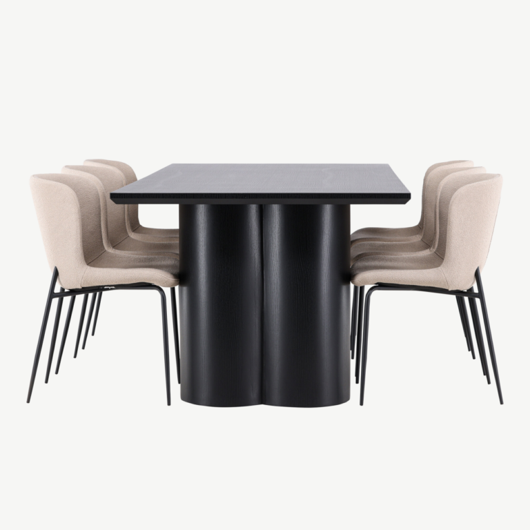 Avasta modernne ja ajatu söögikomplekt: must Olivia MDF-söögilaud ja kuus beeži bukleekangaga polsterdatud Modesto tooli. See luksuslik komplekt annab sinu söögitoale põhjamaise elegantsi ning pakub maksimaalset mugavust nii igapäevasteks õhtusöökideks kui ka erilisteks sündmusteks.