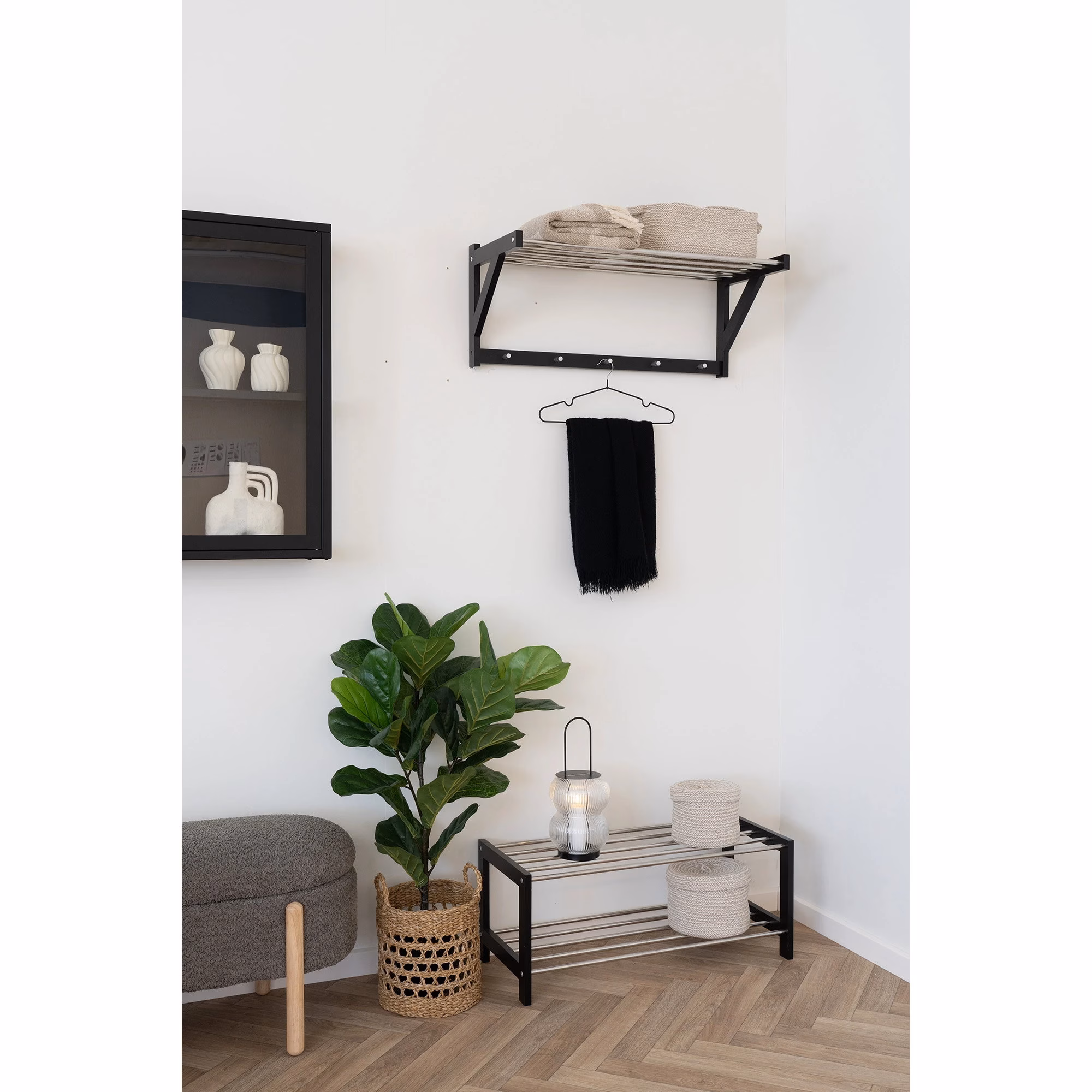 Latern on valmistatud metallist raamiga, mis annab konstruktsioonile stabiilsuse ja selge vormi. Külgi katvad klaaspaneelid lasevad küünlal valgust anda, aidates samal ajal leegil tuule eest veidi varjus olla. Must viimistlus loob neutraalse ja ajatu ilme, mida on lihtne kokku sobitada nii heledate kui ka tumedamate aiamööbli ja dekoratsioonidega.