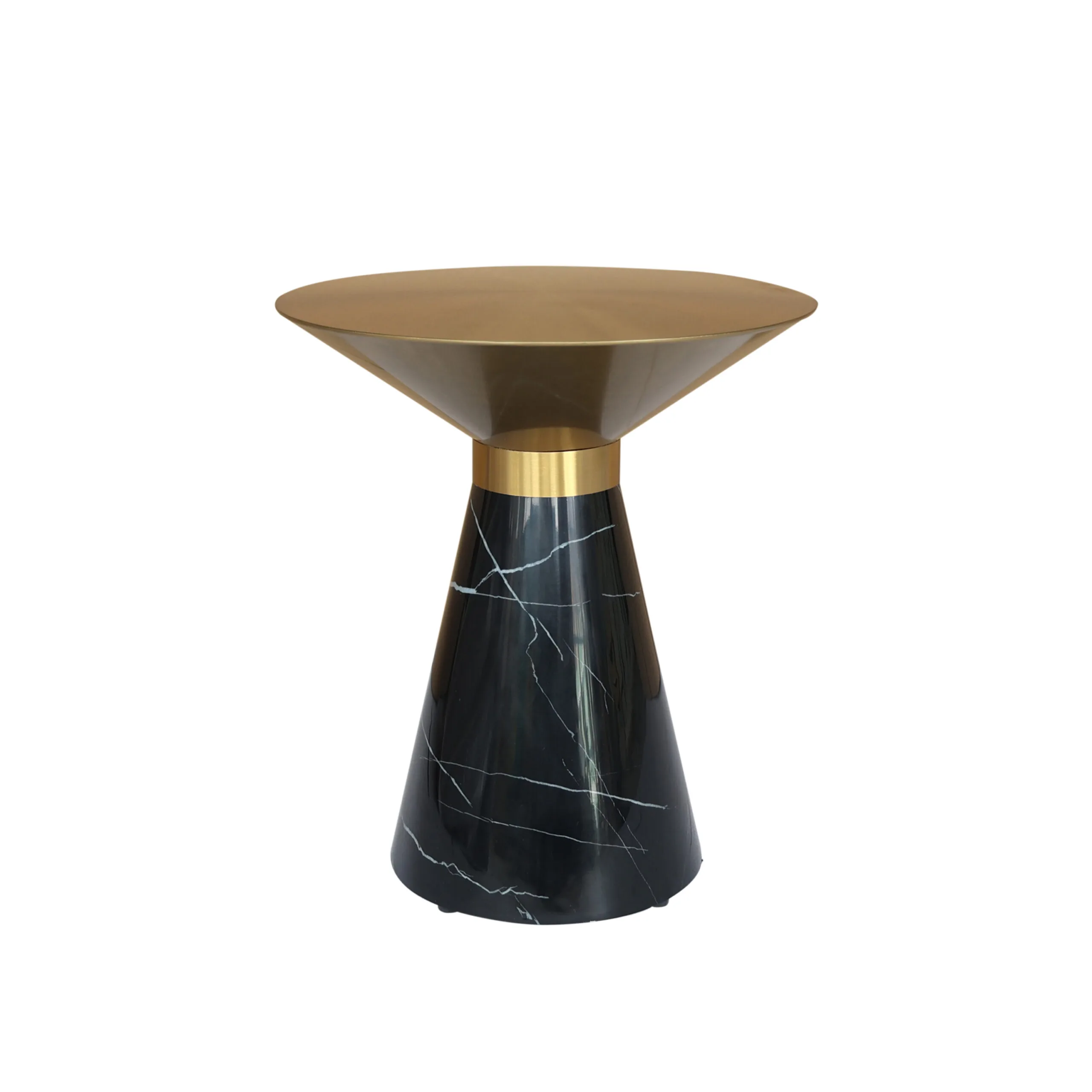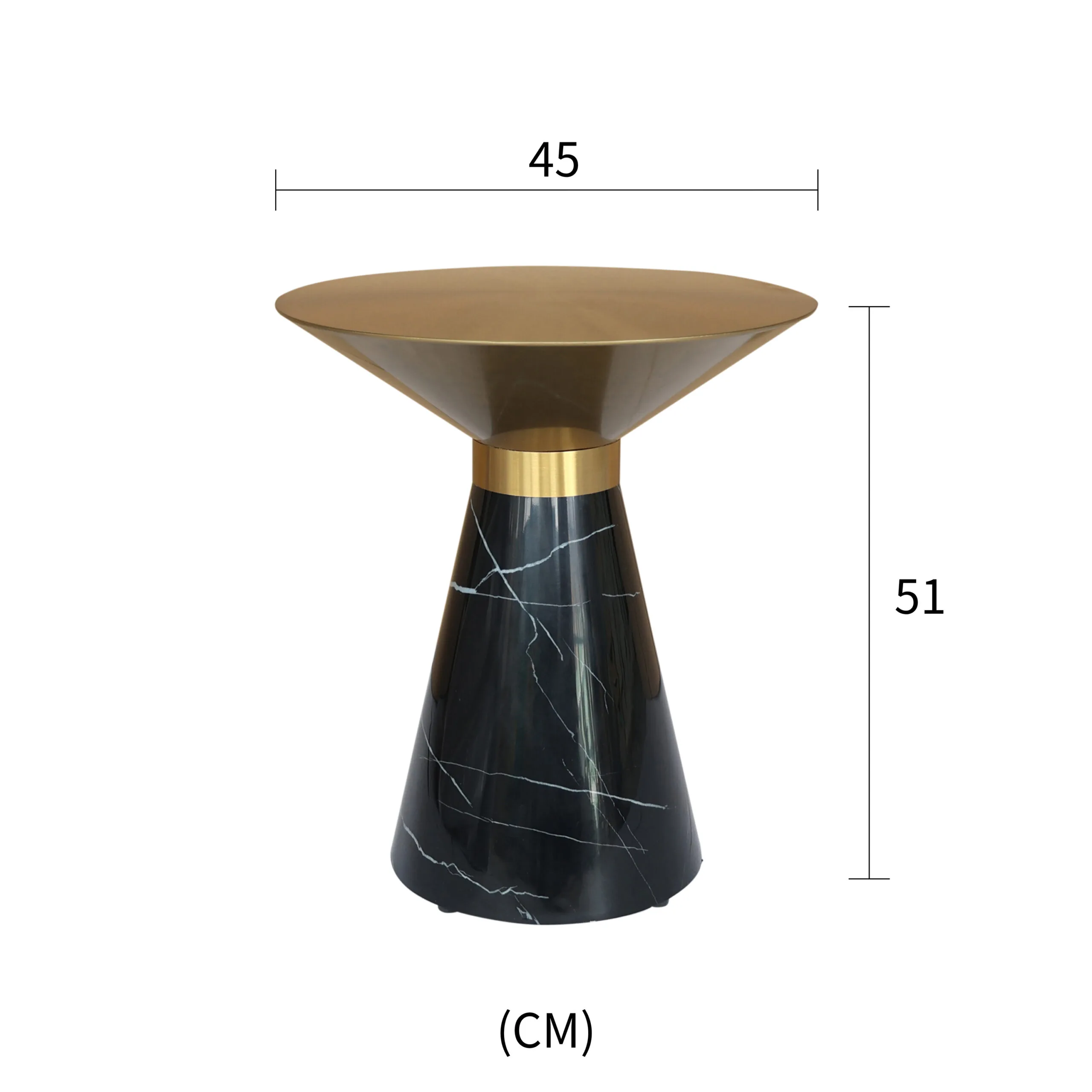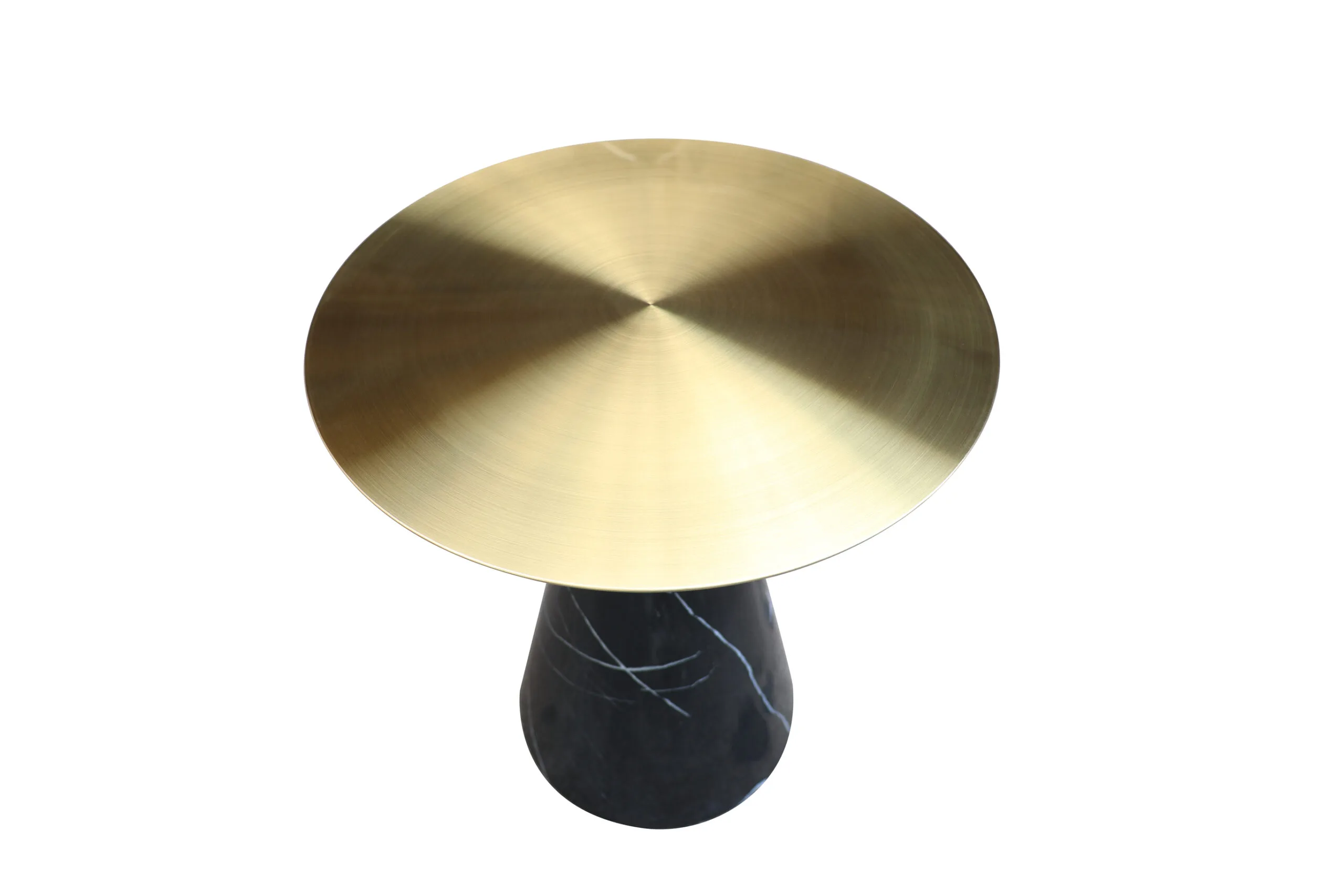Laua metallist alus ja roostevabast terasest pealispind tagavad vastupidavuse ja pikaealisuse. Must jalg lisab kontrasti ja elegantsi, samas kui kuldne pealispind toob ruumi luksuslikku sära. Koonuskujuline alus mitte ainult ei paku stabiilsust, vaid ka visuaalset huvi, muutes selle laua pilkupüüdvaks keskpunktiks igas toas.