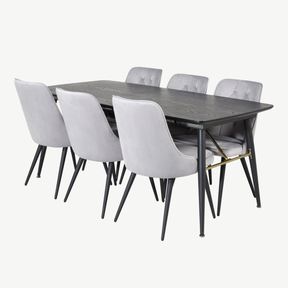 Must pikendatav söögilaud komplekt ühendab modernse laua luksuslike messingdetailidega ning helehallid sametist toolid põhjamaise stiiliga. Ergonomiliselt kaarjas tooli seljatugi ja polsterdus tagavad suurepärase istumismugavuse nii igapäevasteks kui pidulikeks õhtusöökideks. See efektne ning praktiline komplekt sobib suurepäraselt igasse interjööri.