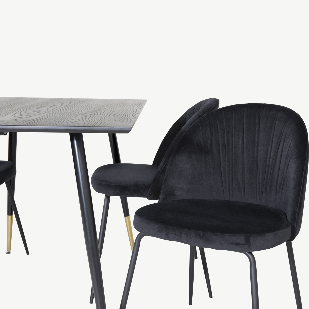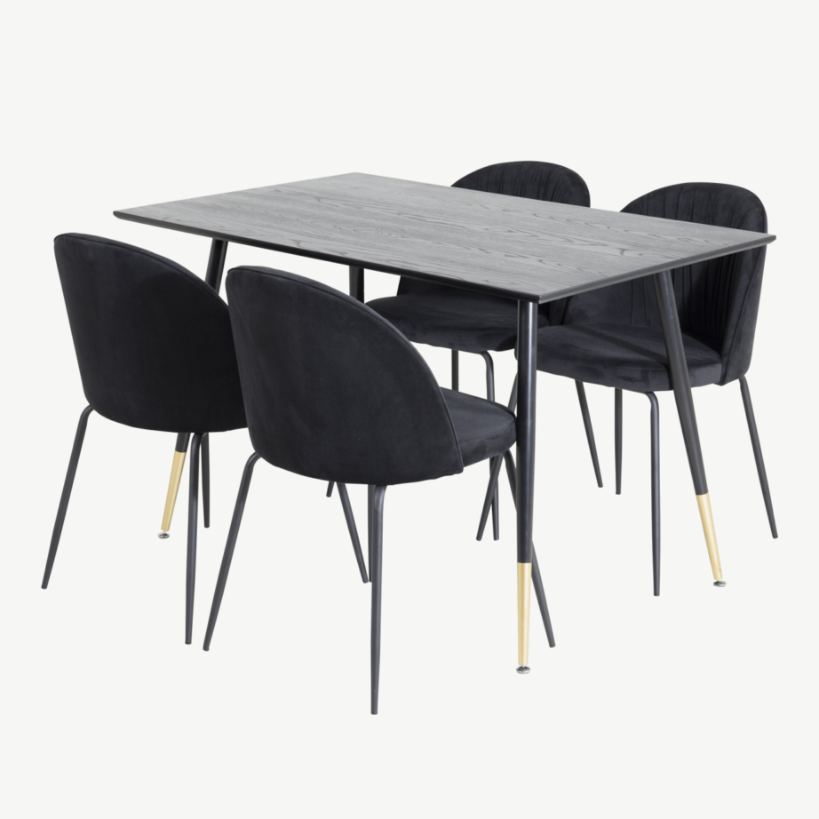 Dipp must söögilauakomplekt ühendab kaasaegse vormikeele ja hoolikalt valitud materjalid, et muuta iga einestamis- ja koosviibimispind stiilseks ning õdusa hubasusega. Komplekti kuulub musta viimistlusega ristkülikukujuline söögilaud ning neli sametkattega tooli, mille disain pakub nii mugavat istet kui ka esinduslikku välimust. Mööbel kuulub hinnatud Venture Home’i kollektsiooni ning täiendab ideaalselt põhjamaist interjööri.