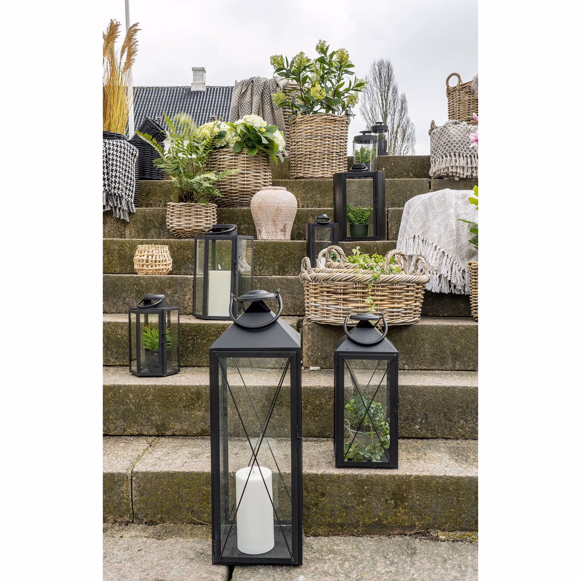 Laternate karkass on valmistatud terasest, mis loob selge vormi ja raamib valguse kenasti ära. Küljed on klaasist, nii et küünlaleek paistab mitmest suunast hästi välja ja tulemus on ühtlaselt valgustatud. Must viimistlus annab laternatele neutraalse ja ajatu ilme, mis sobib nii kaasaegsesse kui ka klassikalisemasse keskkonda.