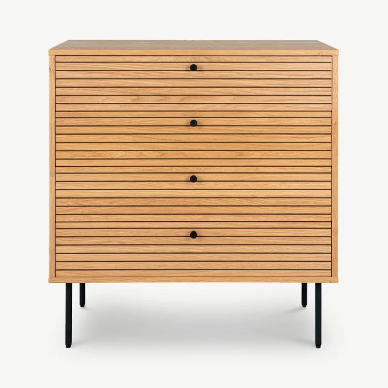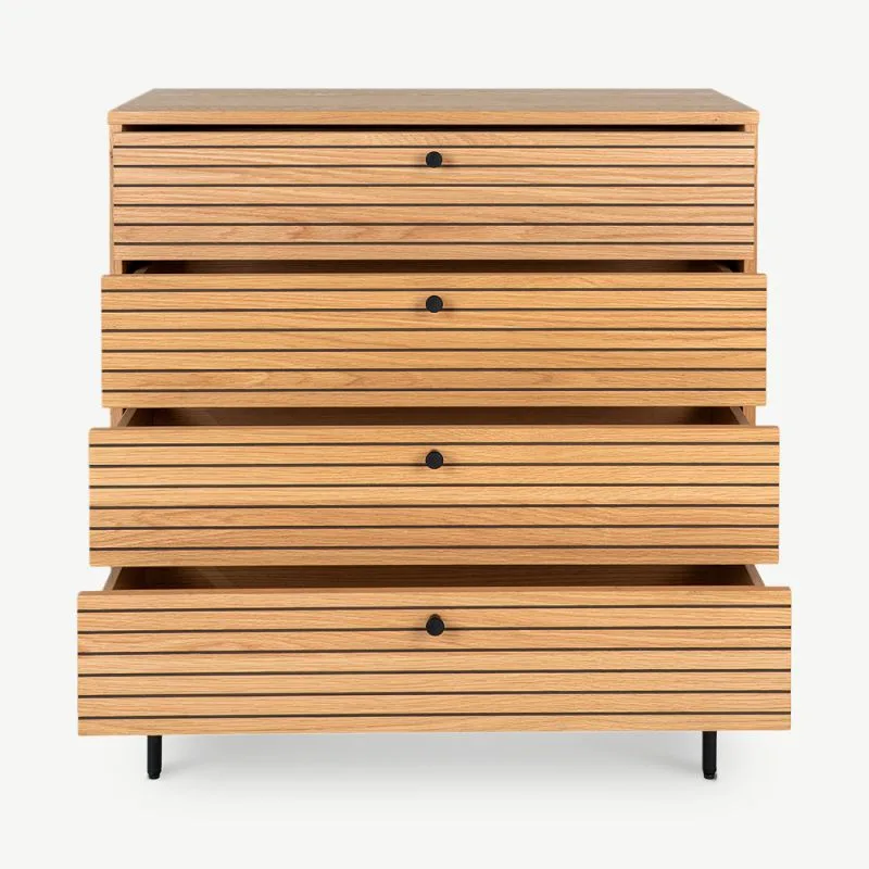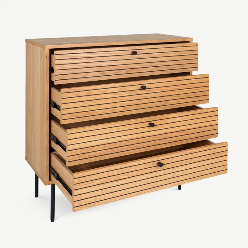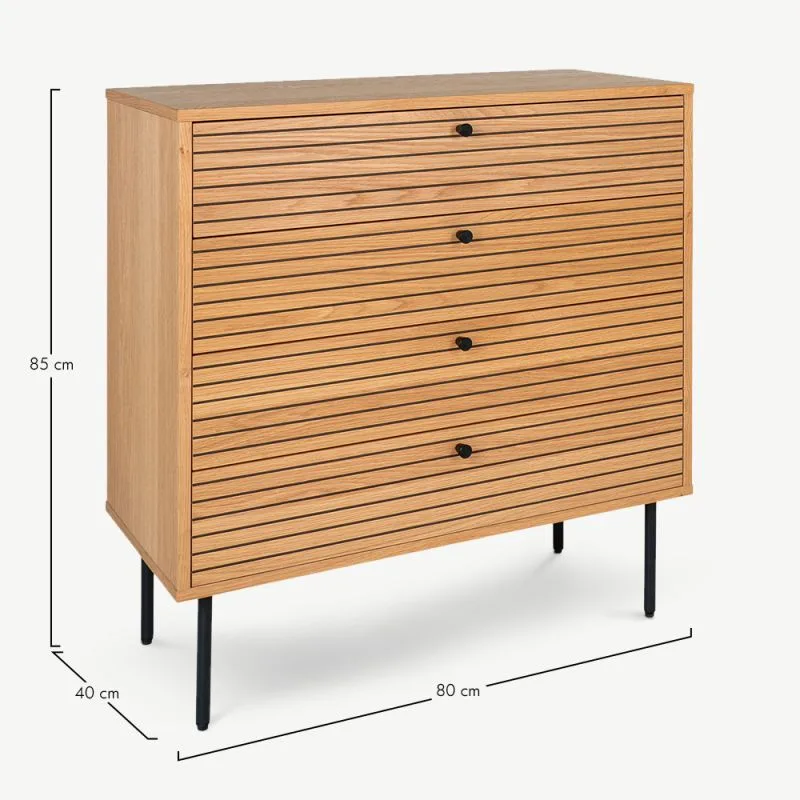 Neli avarat sahtlit pakuvad rohkelt hoiuruumi riiete, voodipesu või muude esemete organiseerimiseks. Kompaktsete mõõtmete tõttu (laius 40 cm, kõrgus 85 cm, sügavus 80 cm) sobib kummut hästi nii magamistuppa, elutuppa kui ka esikusse. Selle läbimõeldud disain aitab hoida kodu korras, ilma et see võtaks liigselt ruumi.