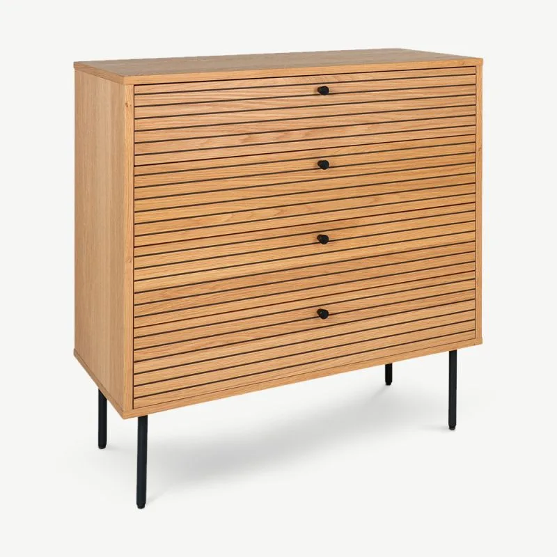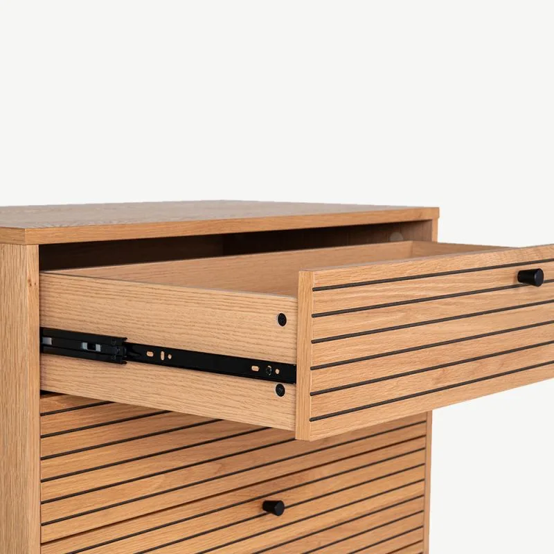 Nara tammepuidust kummut ühendab stiili ja praktilisuse, pakkudes funktsionaalset ning ajatut hoiulahendust igasse koju. Selle naturaalne tammepuidust spoon toob esile kauni puidutekstuuri, samal ajal kui lamellfassaad lisab visuaalset sügavust. Mustad metallist jalad annavad kummutile kaasaegse ilme ja tagavad stabiilsuse, muutes selle sobivaks nii modernsesse kui ka skandinaavialikku interjööri.