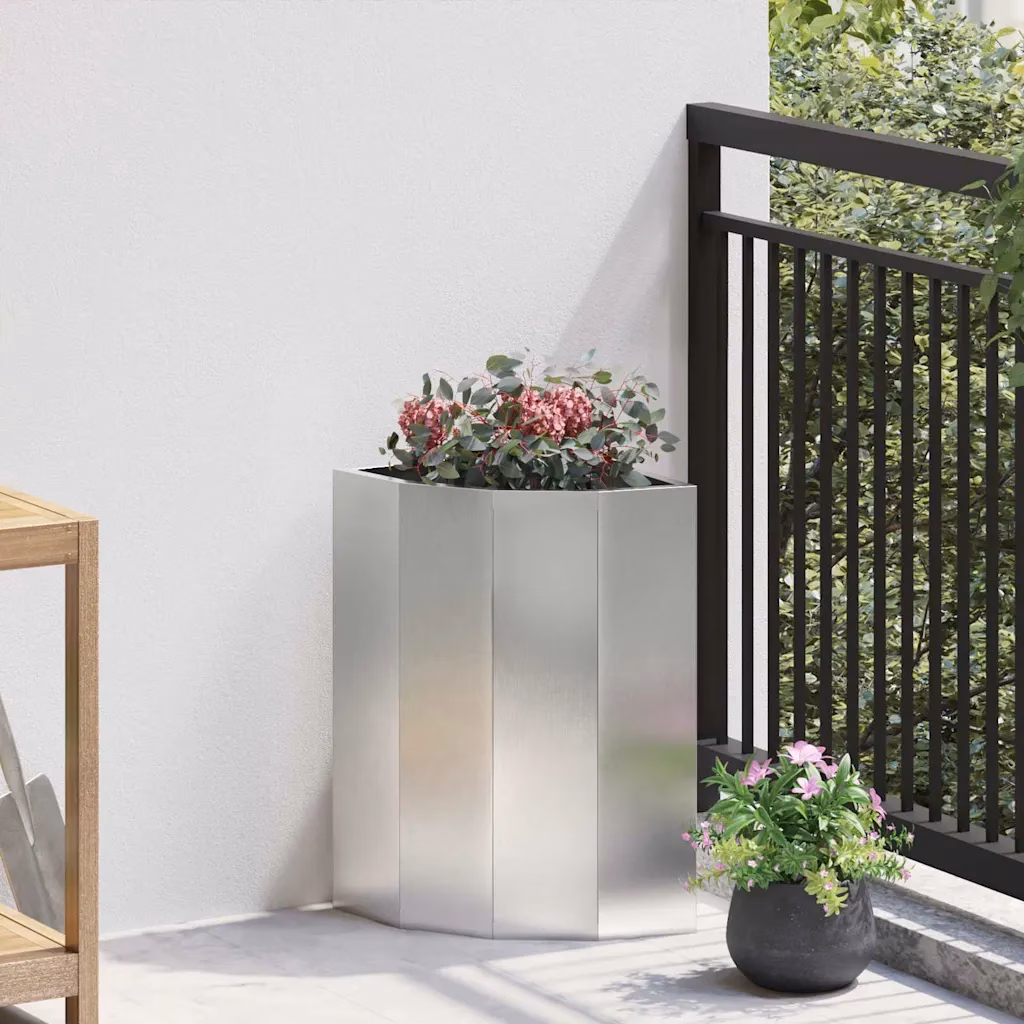 Vali see roostevabast terasest nurga istutuskast, kui soovid tõhusalt ära kasutada välisruumi nurgad ja lisada rõdule, terrassile või aeda modernse hõbedase aktsendi. Vastupidav materjal ja ajatu disain sobivad nii hooajaliseks kui aastaringseks haljastuseks.