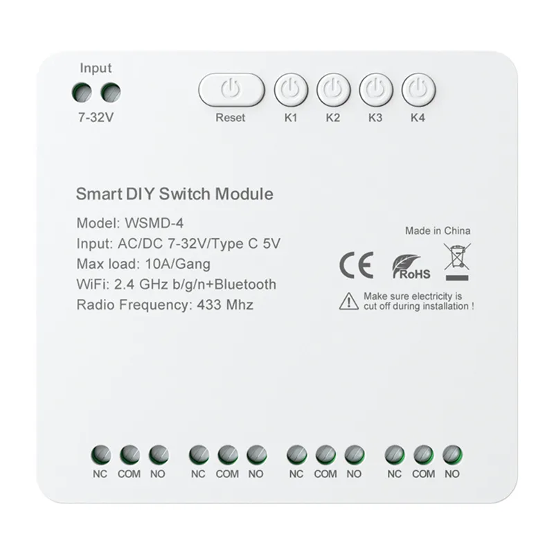 Nutikas 4-kanaline DIY lülitusmoodul Wi‑Fi 2.4 GHz ja Bluetoothiga AVATTO WSMD-4 32V, 7–32 V AC/DC või USB‑C 5 V, 10 A/kanal, 433 MHz RF, Tuya/Smart Life, Alexa/Google