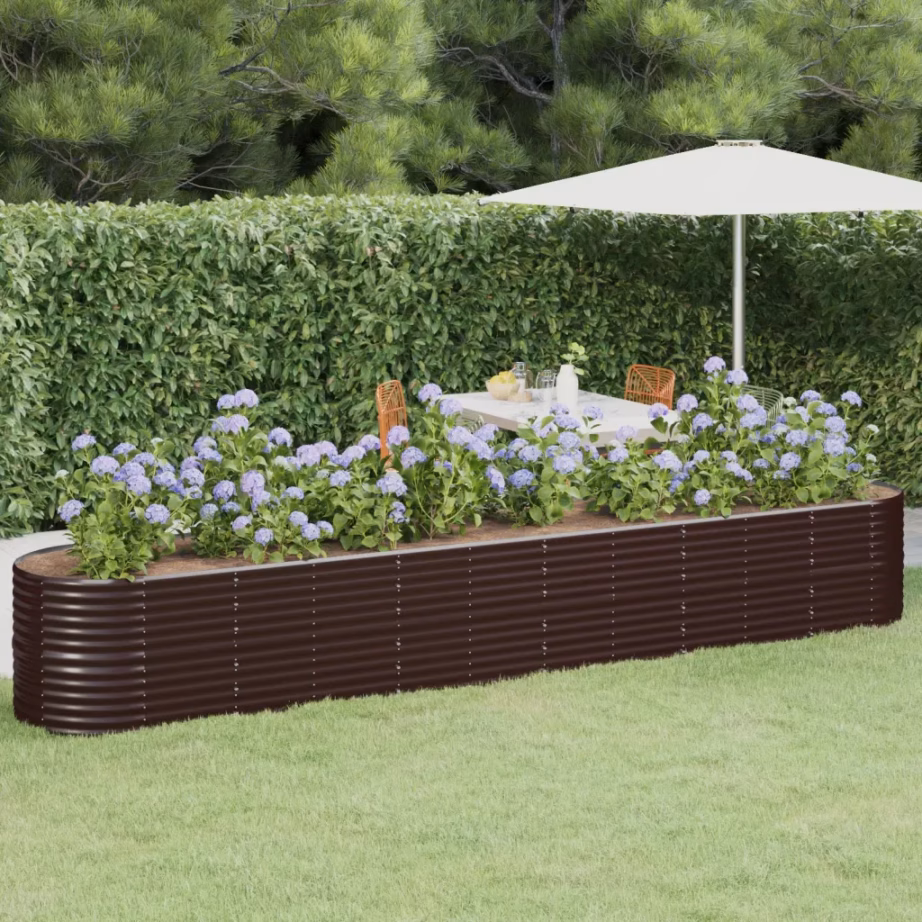 Pruunist galvaniseeritud terasest ovaalne aia taimelava pakub rohkelt ruumi taimede, juurviljade, ürtide ja lillede kasvatamiseks. 440 x 80 x 68 cm mõõtmetega kõrgendatud peenar sobib kasutamiseks aias, rõdul või verandal ning aitab luua korrastatud ja mugava kasvuala. Tänu pulbervärvitud pinnale peab taimelava hästi vastu erinevatele ilmastikuoludele.