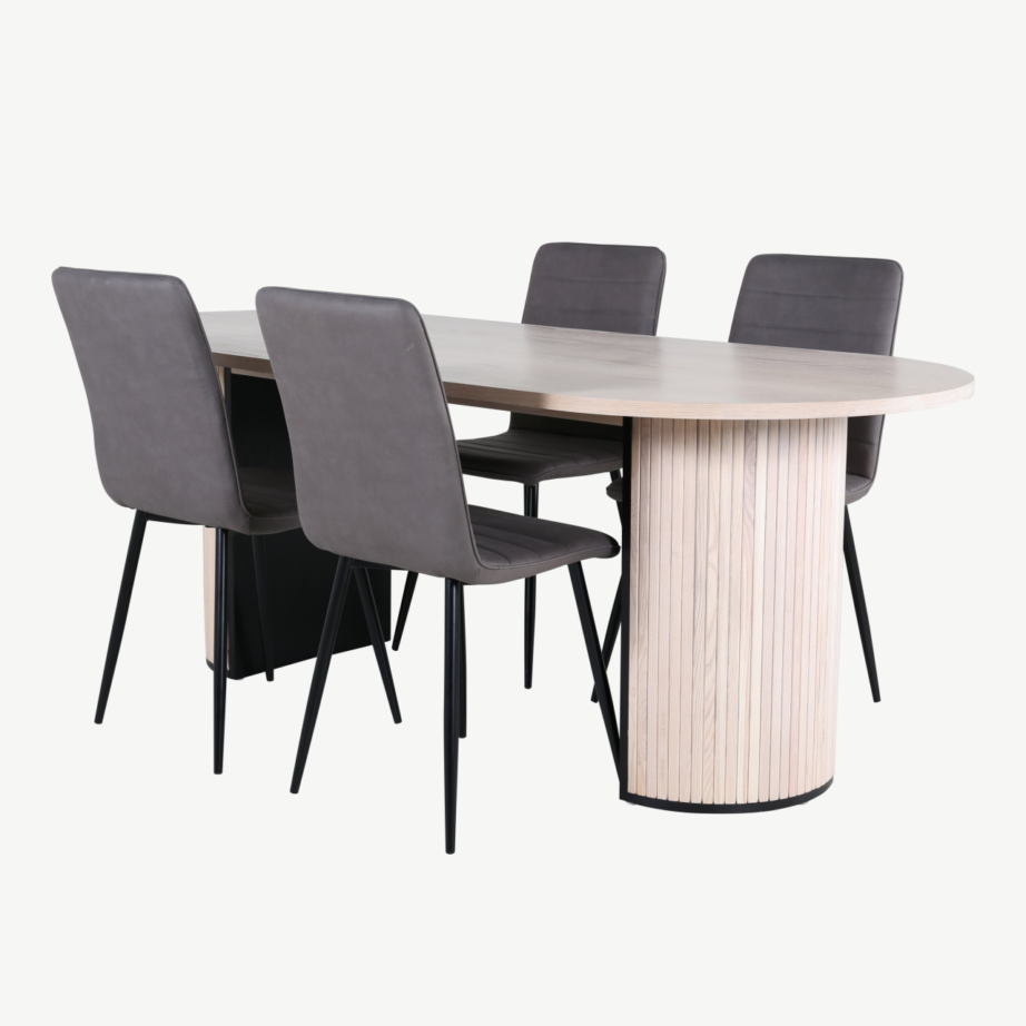 Bianca ovaalne söögilauakomplekt ühendab endas põhjamaise klassika ja kaasaegse stiili, muutes iga söögikorra eriliseks elamuseks. Komplekti kuulub elegantne ovaalne söögilaud valge peitsiga viimistluses ning neli mugavat Windu tooli, mille hall polsterdatud iste ja mustad metalljalad lisavad interjöörile stiilsust ja modernsust.