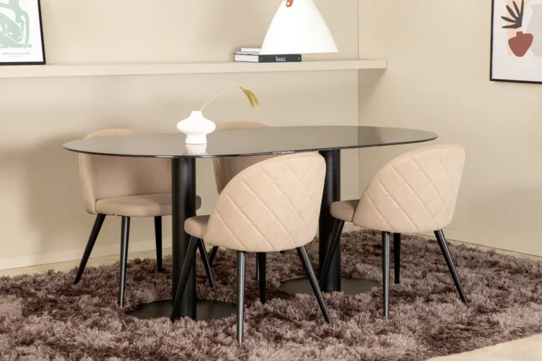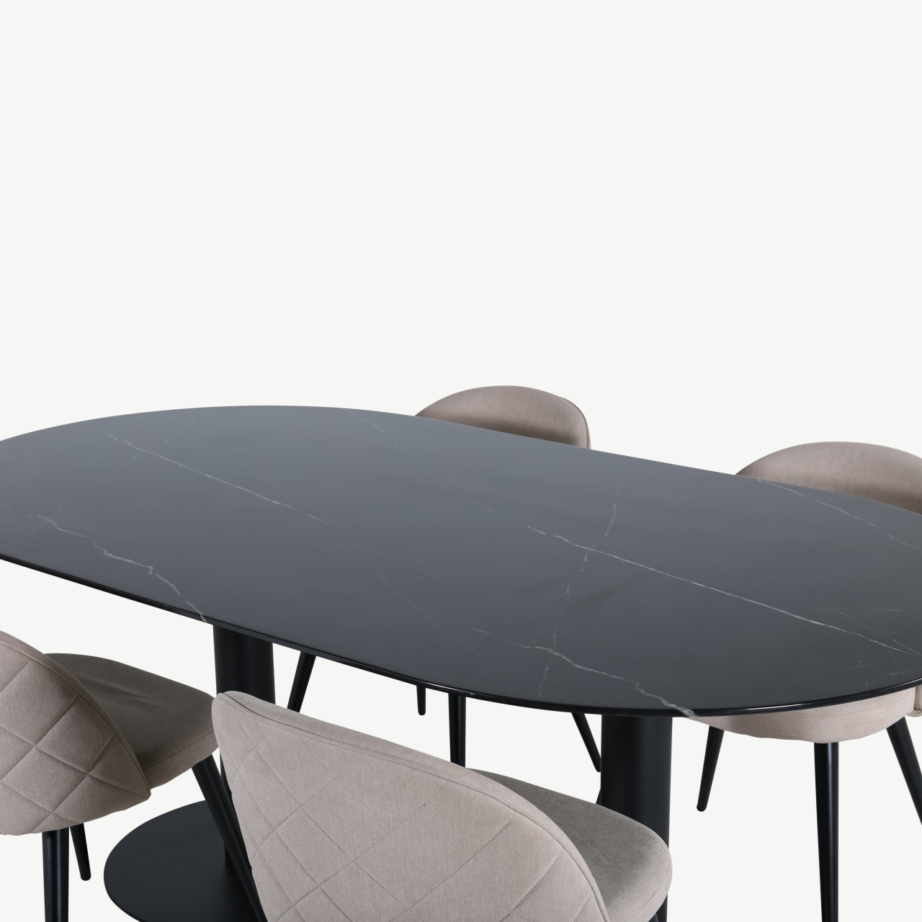 Ovaalne marmorklaasist söögilauakomplekt Pillan ühendab endas luksusliku disaini ja igapäevase mugavuse, tuues Sinu koju kaasaegse ning kutsuva atmosfääri. Elegantne must marmorklaasist lauaplaat ja beežid pehme polsterdusega toolid loovad harmoonilise koosluse, mis täiustab nii modernset kui ka klassikalist põhjamaist interjööri.