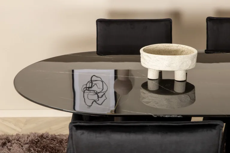 Ovaalne musta klaasiga söögilaud Pillan koos sametkattega Petra toolidega lisab igale kodule ajatult stiilset põhjamaist hõngu. Pilkupüüdev ovaalne laua kuju toob ruumi avarust ning elegantset pehmust. Must marmormustriga klaasist lauaplaat on ühtaegu praktiline ja vastupidav – seda on lihtne hooldada ning pind peab vastu ka igapäevasele kasutusele, säilitades oma kauni väljanägemise aastaid. Kahe tugeva mustast terasest laua aluse tõttu on laud väga stabiilne ja loob visuaalselt kerge ning modernse ilme.