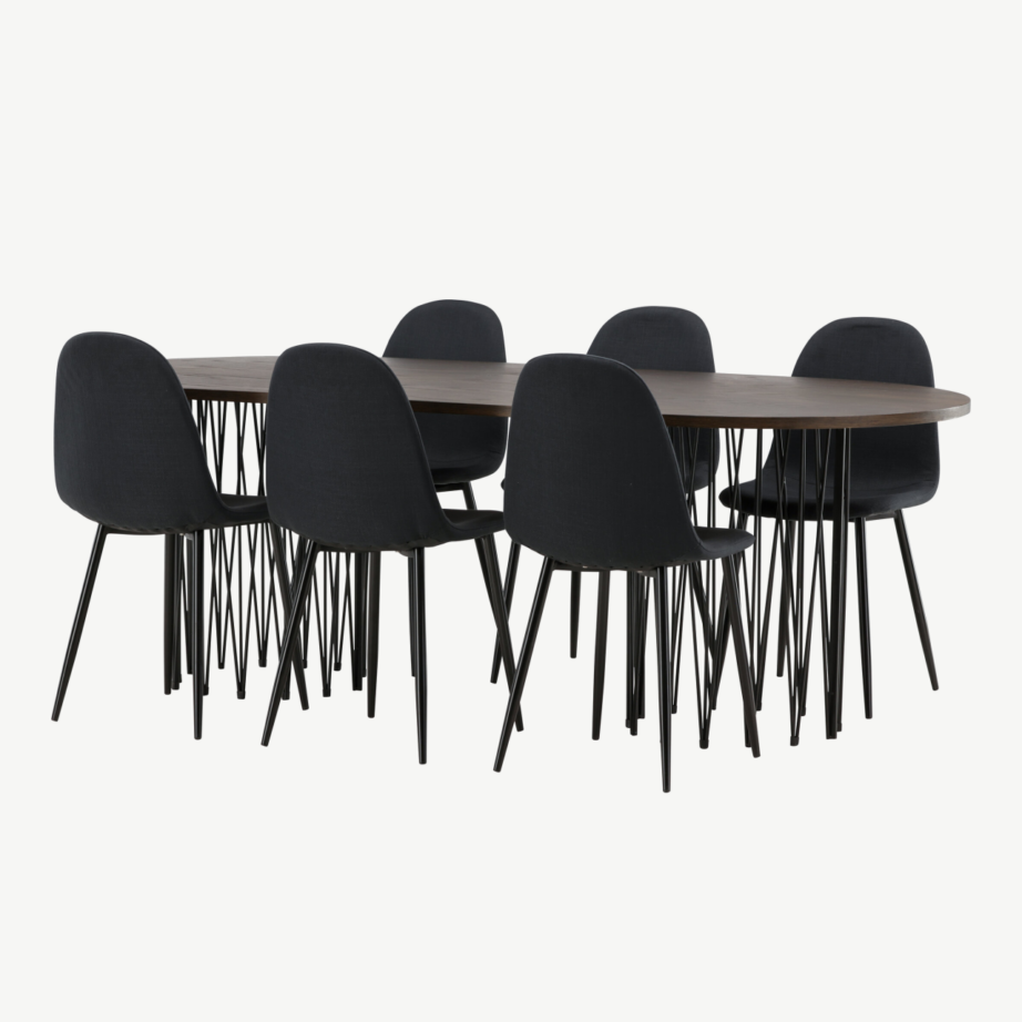 Komplekti kuulub kuus Polar sarja söögitooli, mille pehmendatud istmed ja seljatoed on kaetud vastupidava musta polüesterkangaga. Need mugavad toolid toetavad ka pikema õhtusöögi ajal ning nende mustad pulbervärvitud metalljalad sobituvad suurepäraselt laua modernse moega.