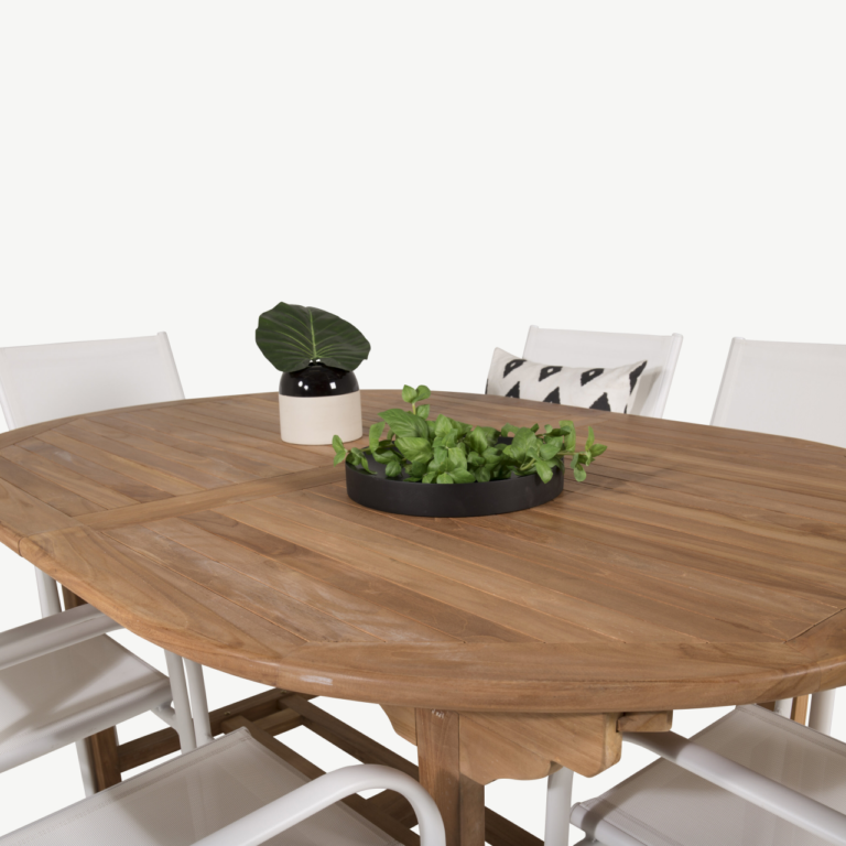 Loo põhjamaise stiiliga terrass või aianurk Venture Home’i kõrgekvaliteedilise tiigipuust õuemööbli komplektiga. Komplekti kuulub pilkupüüdev ovaalne söögilaud Kenya, mis on valmistatud vastupidavast tiigipuust, ning kuus kaasaegse disainiga Santorini tooli valge raamiga. See tiigipuust õuemööbli komplekt sobib ideaalselt neile, kes hindavad nii vastupidavust kui elegantset põhjamaist välimust.