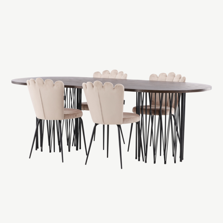 Avastage Stone ovaalne söögilauakomplekt, mis annab põhjamaisele interjöörile eksklusiivse ja hubase ilme. Komplekti kuulub stiilne ovaalne laud ning kuus Limhamn sarja sametist tooli, pakkudes täiuslikku lahendust pere õhtusöökideks ja pidulikumateks koosviibimisteks.