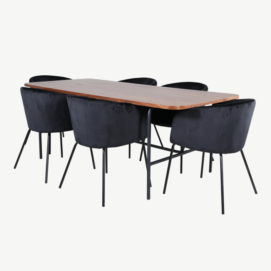 Pähklivineeriga söögilaud ja mustad sametist toolid – Uno & Berit komplekt Sinu söögituppa