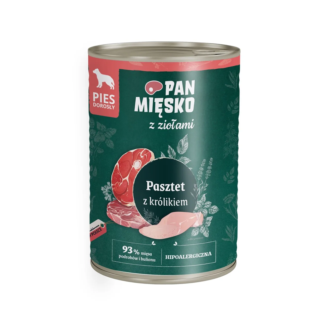 PAN MIĘSKO with herbs küülikupasteet on 400 g märgtoit täiskasvanud koertele, sisaldab küülikuliha ja ürte, sobib eriti gluteeni- ja sojavaba dieeti vajavatele lemmikutele.
