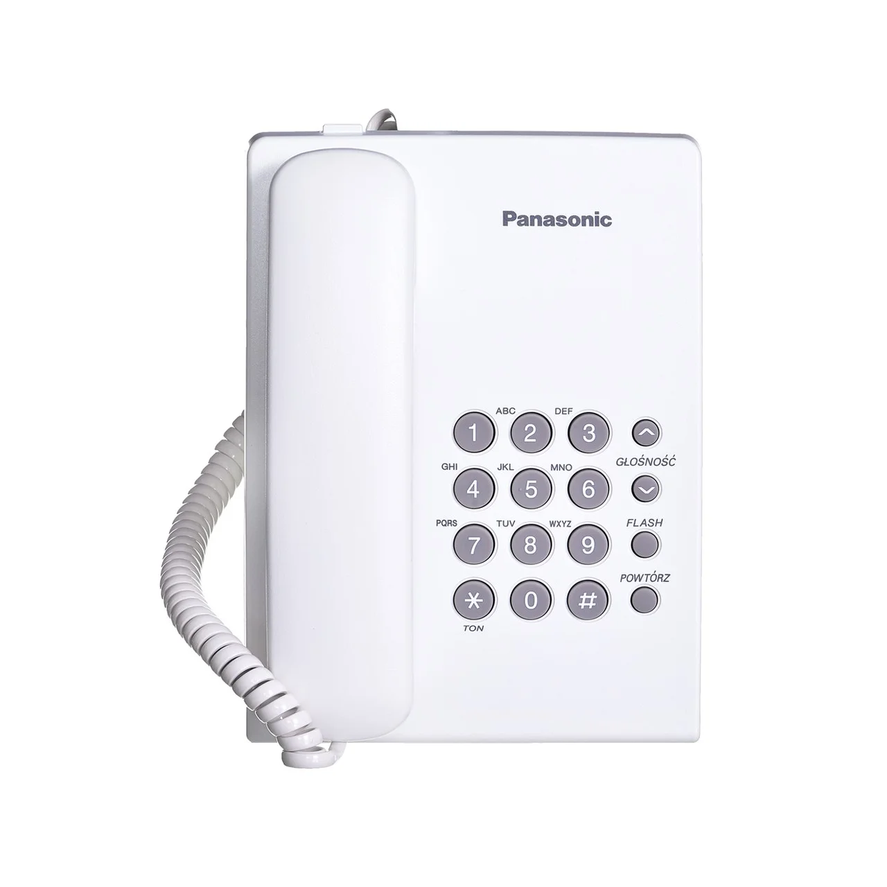 Valge Panasonic KX-TS500PDW on 16 nupuga analooglauatelefon, mida saab paigaldada nii lauale kui seinale ning millel on lihtne juhtmega käsitoru.
