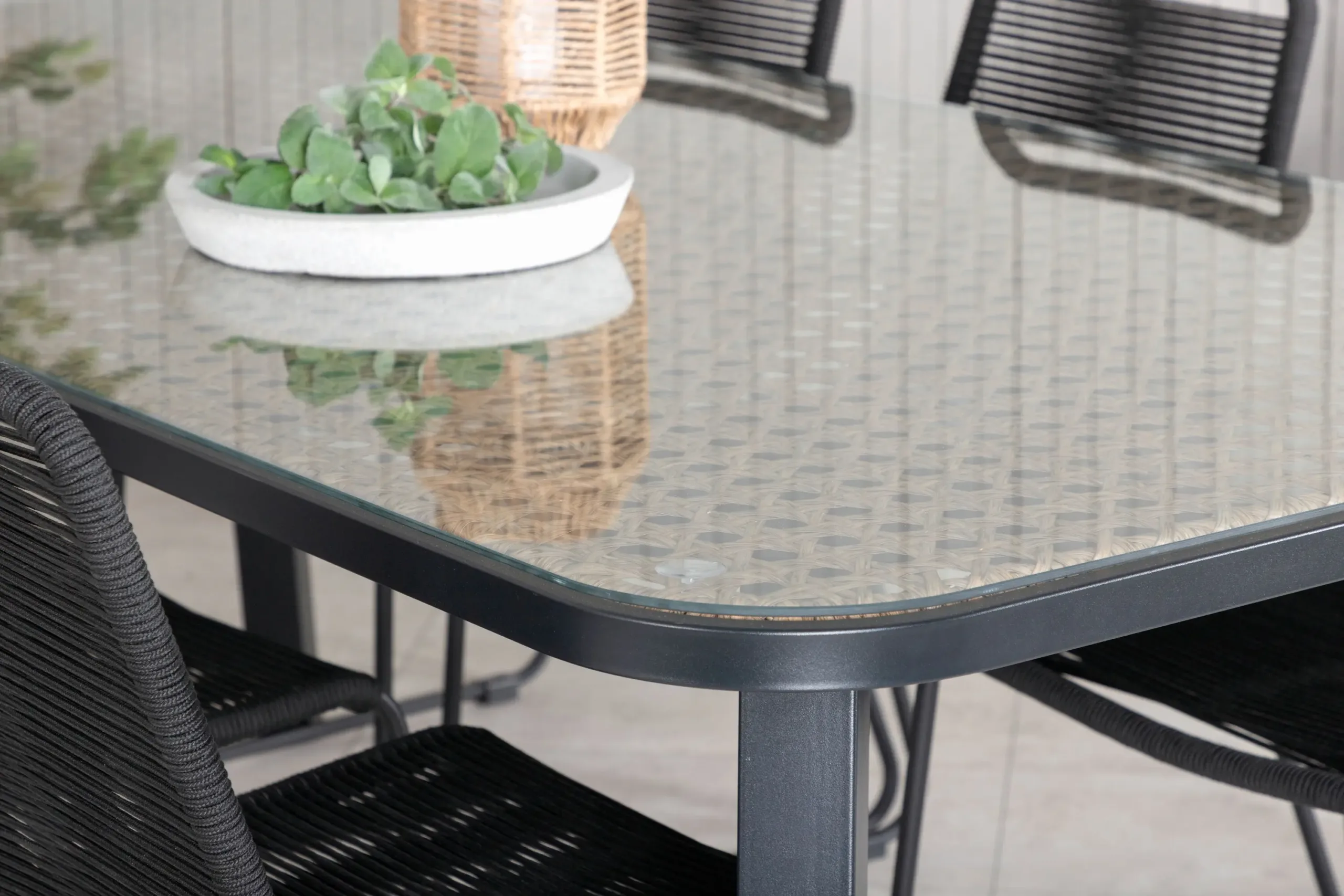 - Lauaplaat: kombinatsioon karastatud klaasist ja liivakarva kunstpunutisest (viimistlus: must & liiv), mis toob esile põhjamaiselt stiilse ilme ja on lihtsasti hooldatav.
