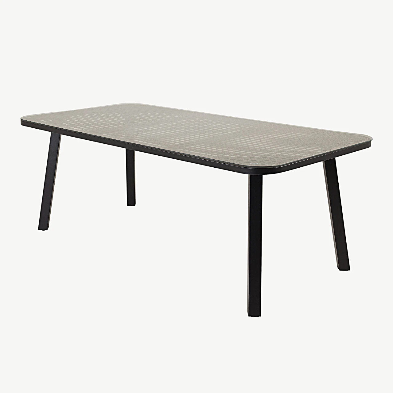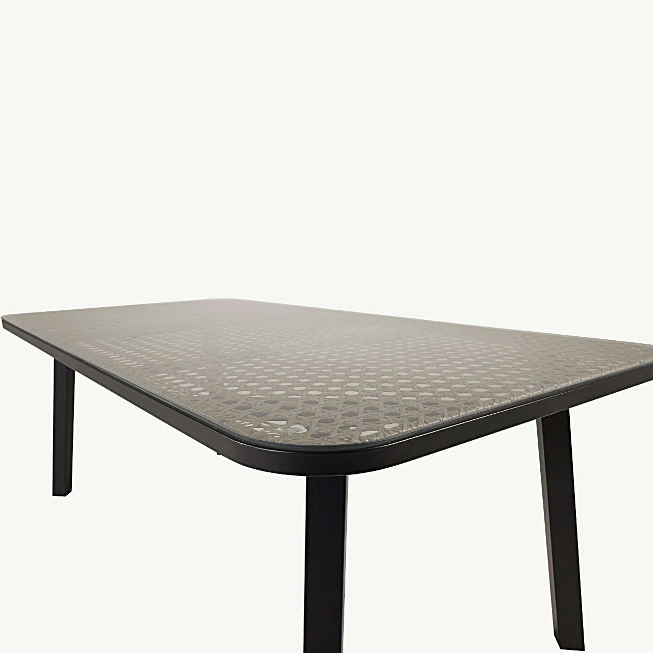 - Karastatud klaasist lauaplaat palmikviimistlusega – kaasaegne välimus ja kergesti puhastatav pind, mis talub hästi ilmastikuolusid.