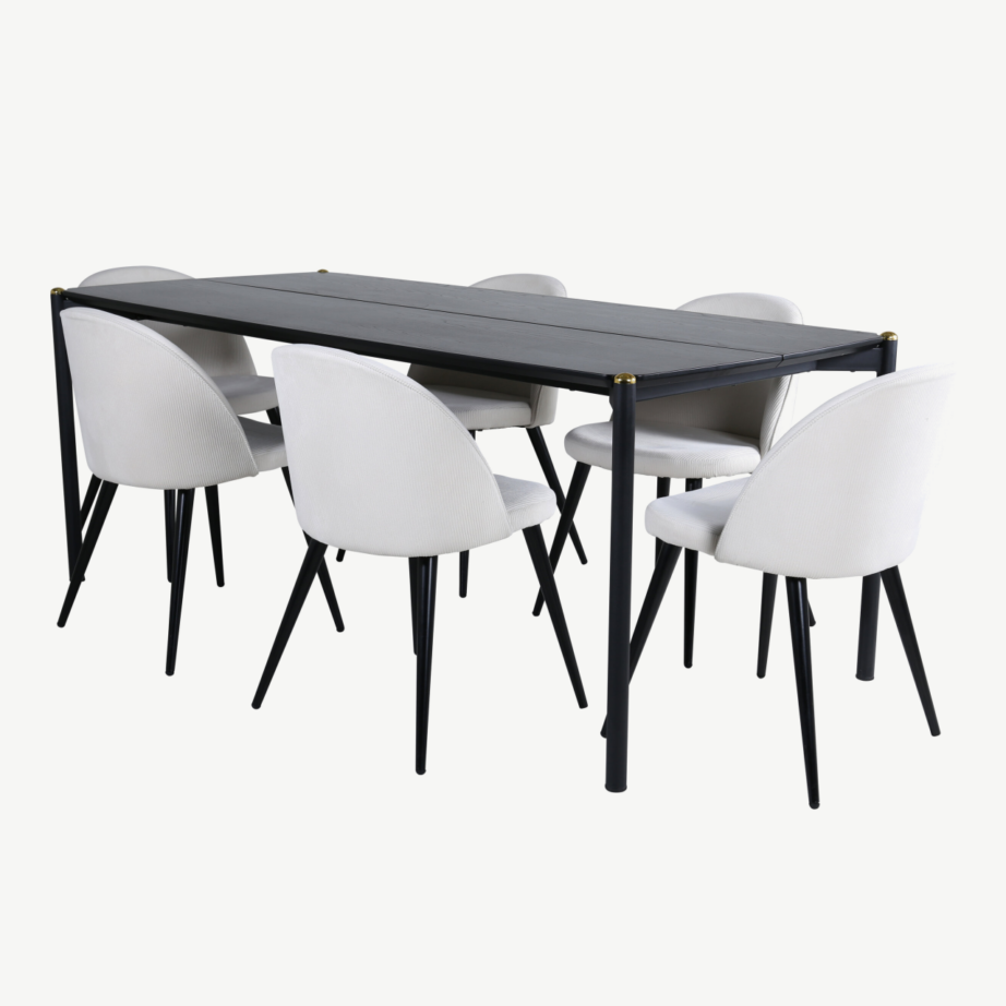 “Must söögilaud toolidega” on selle põhjamaiselt stiilse Pelle söögikomplekti märksõna. Komplekt ühendab ajatult modernse disaini ning suurepärase vastupidavuse. Komplekti kuuluvad mahukas must ristkülikukujuline söögilaud ja kuus mugavat kreemikat tooli, mis on kaetud kvaliteetse Manchester-bukleekangaga. Tegemist on esteetilise ning praktilise lahendusega pereõhtusöökideks ja pidulikumateks üritusteks.