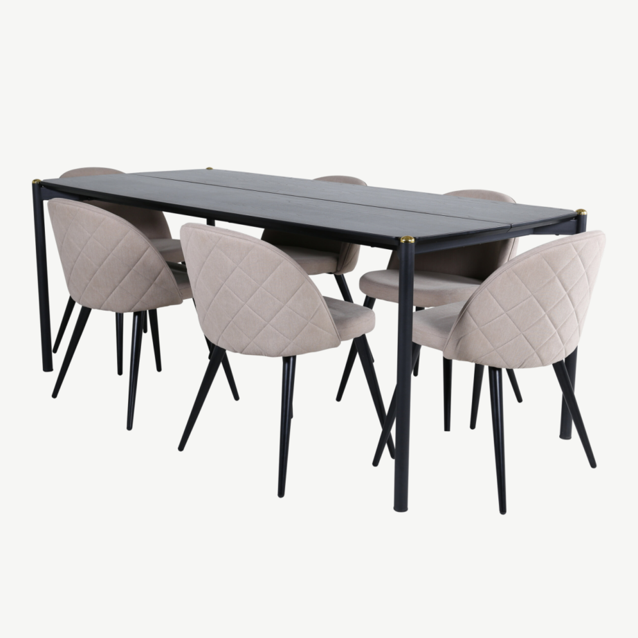 - Komplektis: Must ristkülikukujuline MDF-vineerist söögilaud ja kuus Velvet Stitches beeži tooli (toolid müügil ühekaupa, fotol illustreeritud komplektina)
