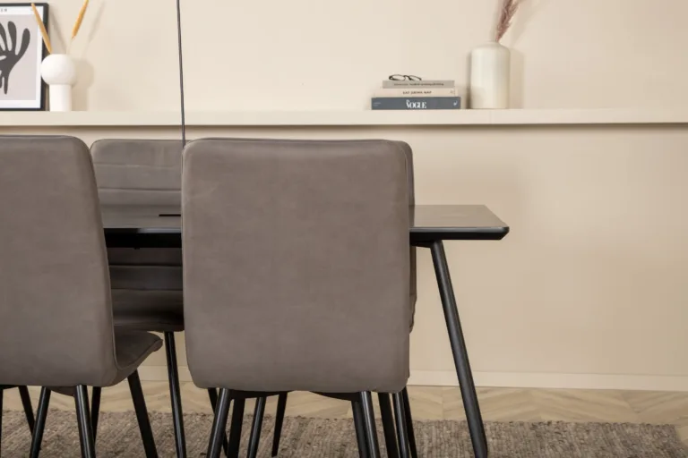 Komplekti kuulub kuus Windu söögitooli, mille istme- ja seljapinnad on kaetud halli mikrofiiberkangaga. Toolid loovad hubase atmosfääri ning mustad rauast jalad garanteerivad stabiilsuse ja kestvuse. Mikrofiiberkangas on tuntud vastupidavuse ja lihtsa hoolduse poolest, muutes need toolid suurepäraseks valikuks igapäevaseks kasutamiseks ka aktiivses peres.