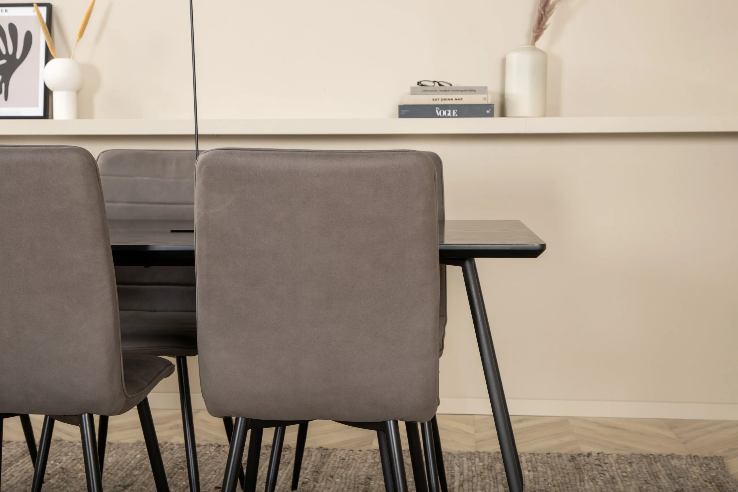 Petra söögitoakomplekt musta ristkülikukujulise lauaga ja 6 halli Windu tooliga ühendab põhjamaise stiili ja praktilise kasutusmugavuse. See elegantne komplekt muudab Sinu söögitoa kutsuvaks ning pakub mugavaid istumiskohti kuni kuuele inimesele. Komplekti keskmes asuv must ristkülikukujuline söögilaud on valmistatud vastupidavast MDF-plaadist ning kaetud musta vineeriga. Õhulised, kergelt väljapoole kaldu mustast rauast jalad lisavad lauale modernset elegantsi ja muudavad selle kergesti sobituvaks nii kaasaegsesse kui klassikalisse interjööri.
