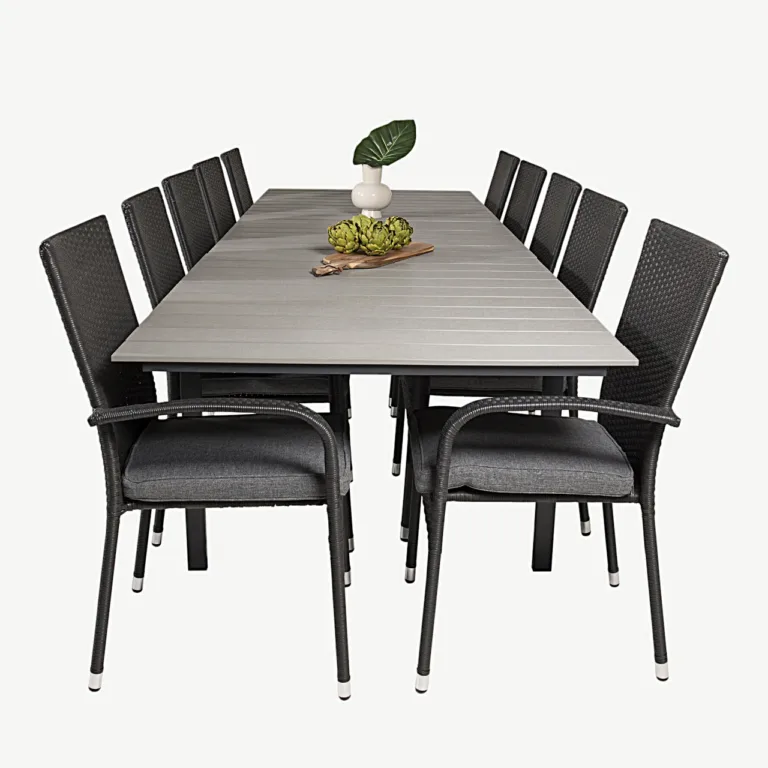 - Kaasaegne värvilahendus: Tumehalli lauaplaadi ja mustade raamidega komplekt sobitub ideaalselt erinevate terrassi- ja aiakeskkondadega, tuues esile põhjamaiselt stiilse joone.